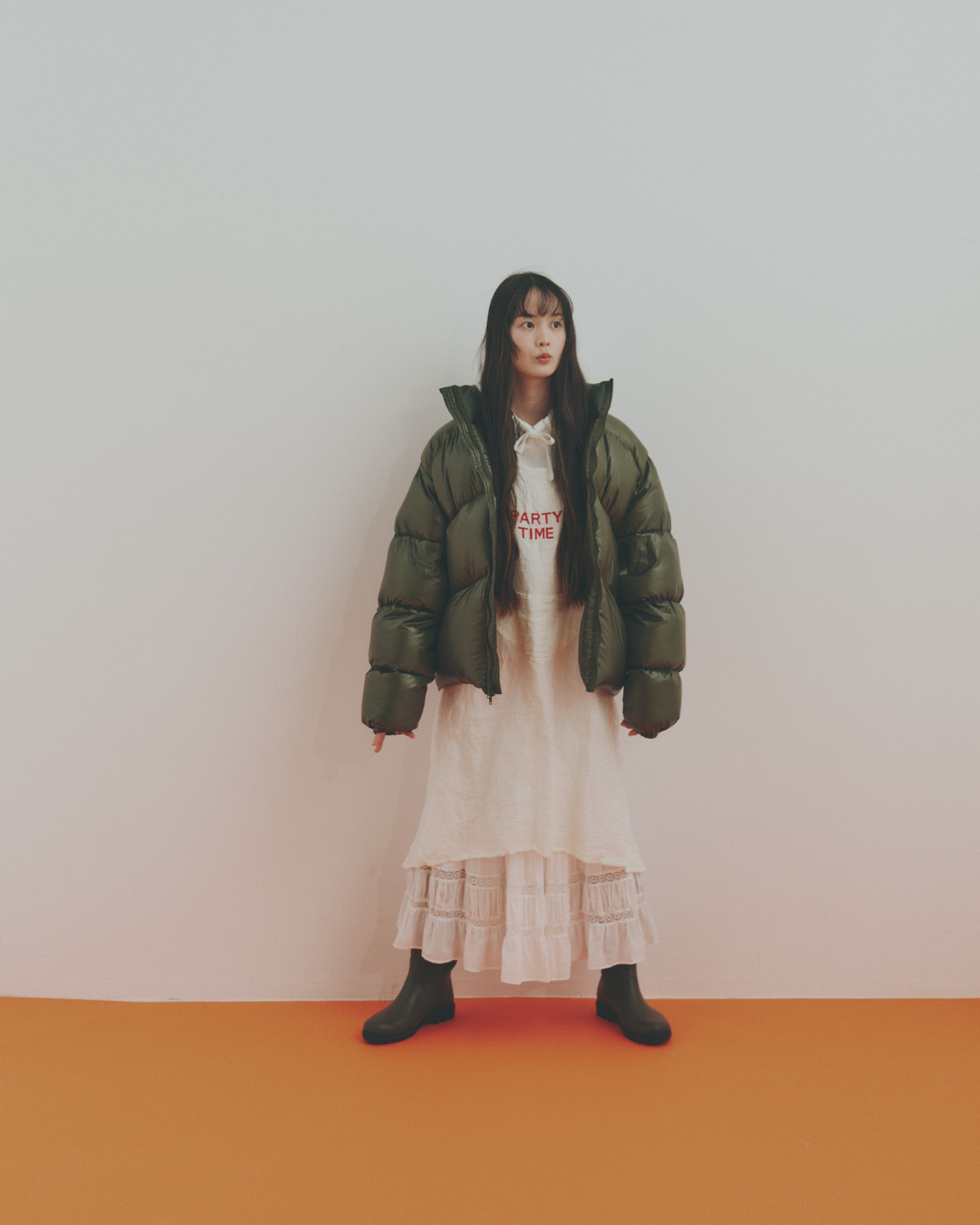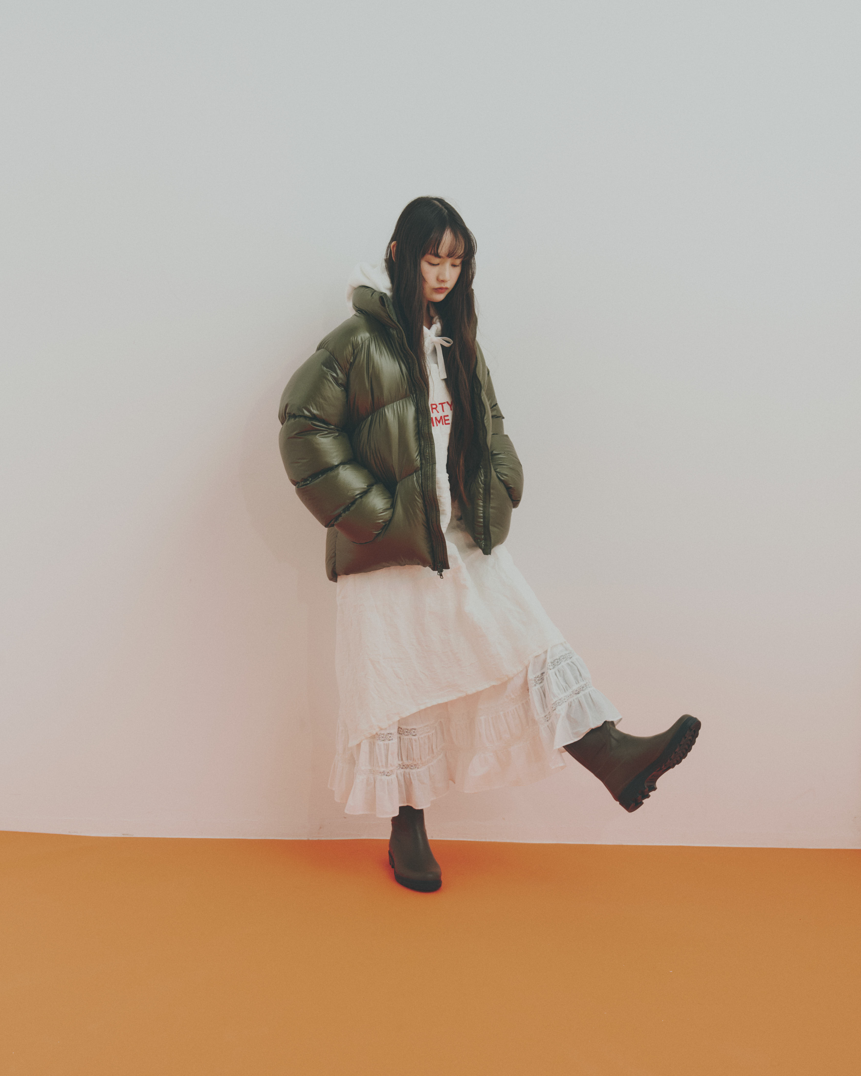 イノセントなホワイトの装いにメンズライクなカーキのダウンジャケットを合わせれば、モノクロとはひと味違う、ニュアンスのある甘辛バランスを楽しめるのです。ブーツもカーキでキリッと引き締めるのがポイント。 仕上げにレイヤードしたエプロンが生むリズムも素敵だね。