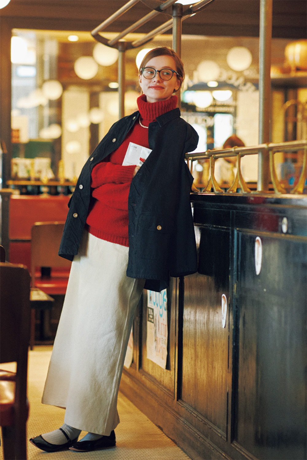 コート¥99000/BRITISH MADE(ブリティッシュメイド 青山本店)、カットソー¥9680/LOISIR(ロワズィール)、デニムパンツ¥13200/Wrangler(エドウイン・カスタマーサービス)、ストール¥15950/TWEEDMILL、手袋¥6930/WILLIAM BRUNTON、バッグ¥24200/AULENTTI(以上すべてセムインターナショナル)、シューズ¥36300/Catworth(グラストンベリーショールーム)、その他/スタイリスト私物