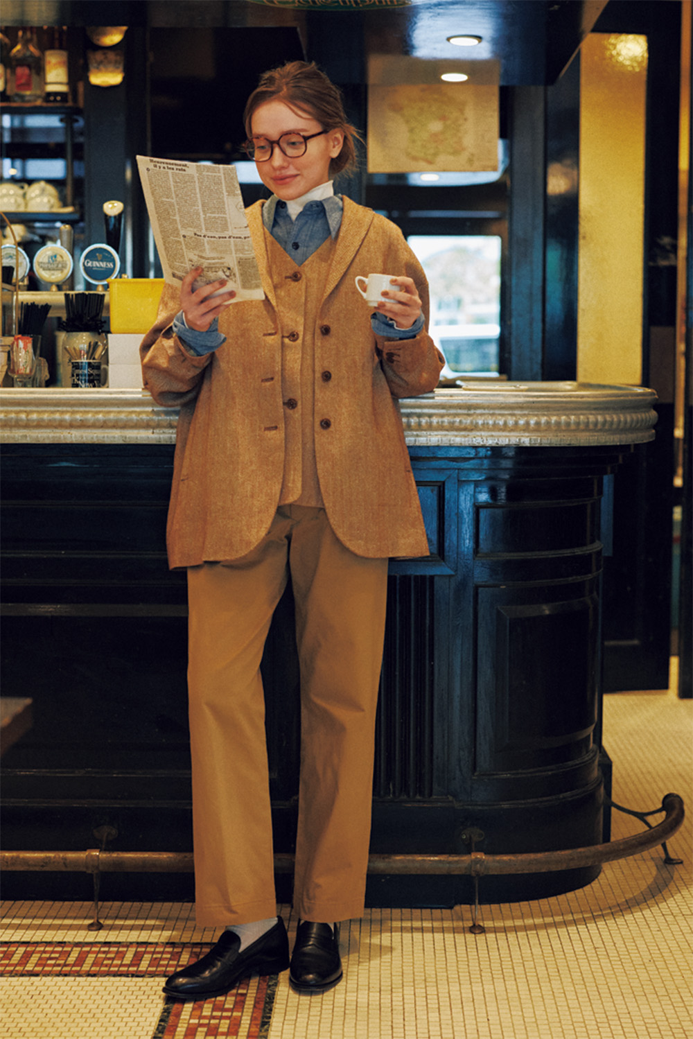カフェのカウンターでエスプレッソを嗜む。まるでパリジャンような、粋なシーンに似合うのは、多角形モデルの「No.222」。クラシカルなべっ甲柄だと、ジャケットスタイルにもマッチして尚よしです