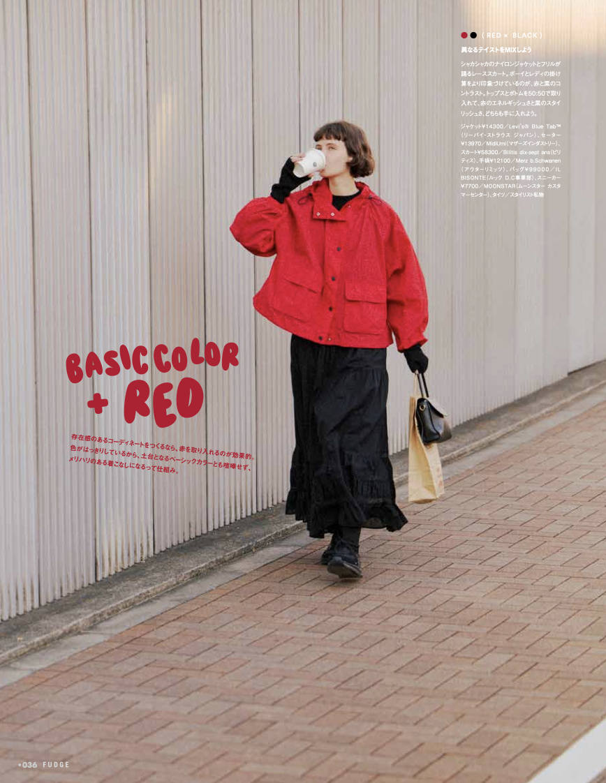 この記事では、「ベーシックカラー×レッド」のスタイリングを、FUDGE FRIENDのうさみ(身長169cm)が着こなします。マネしやすいのにこなれて見える、バイカラースタイルをヒントに、あなたのクローゼットにある色と照らし合わせながら、自分らしい配色を探してみて。