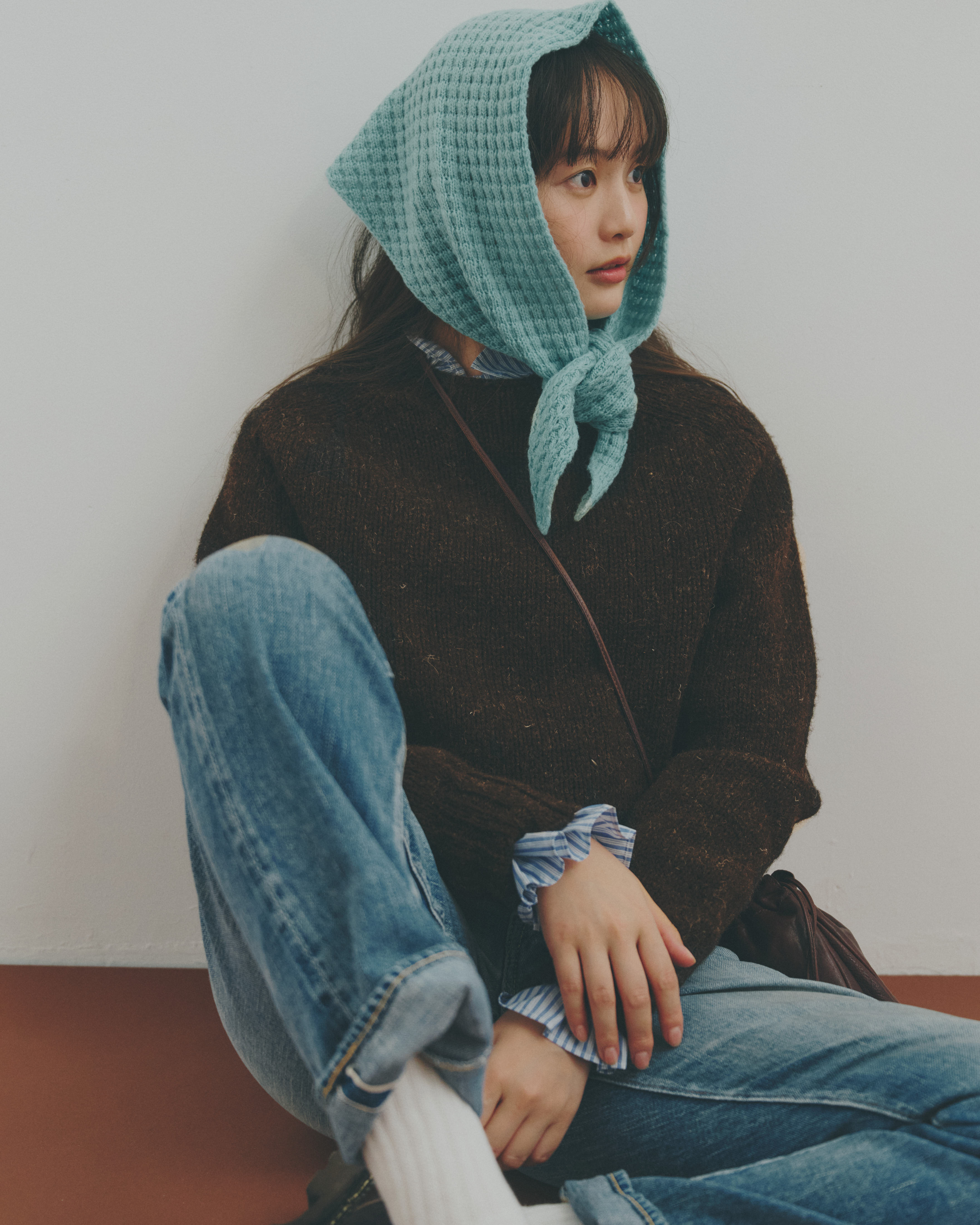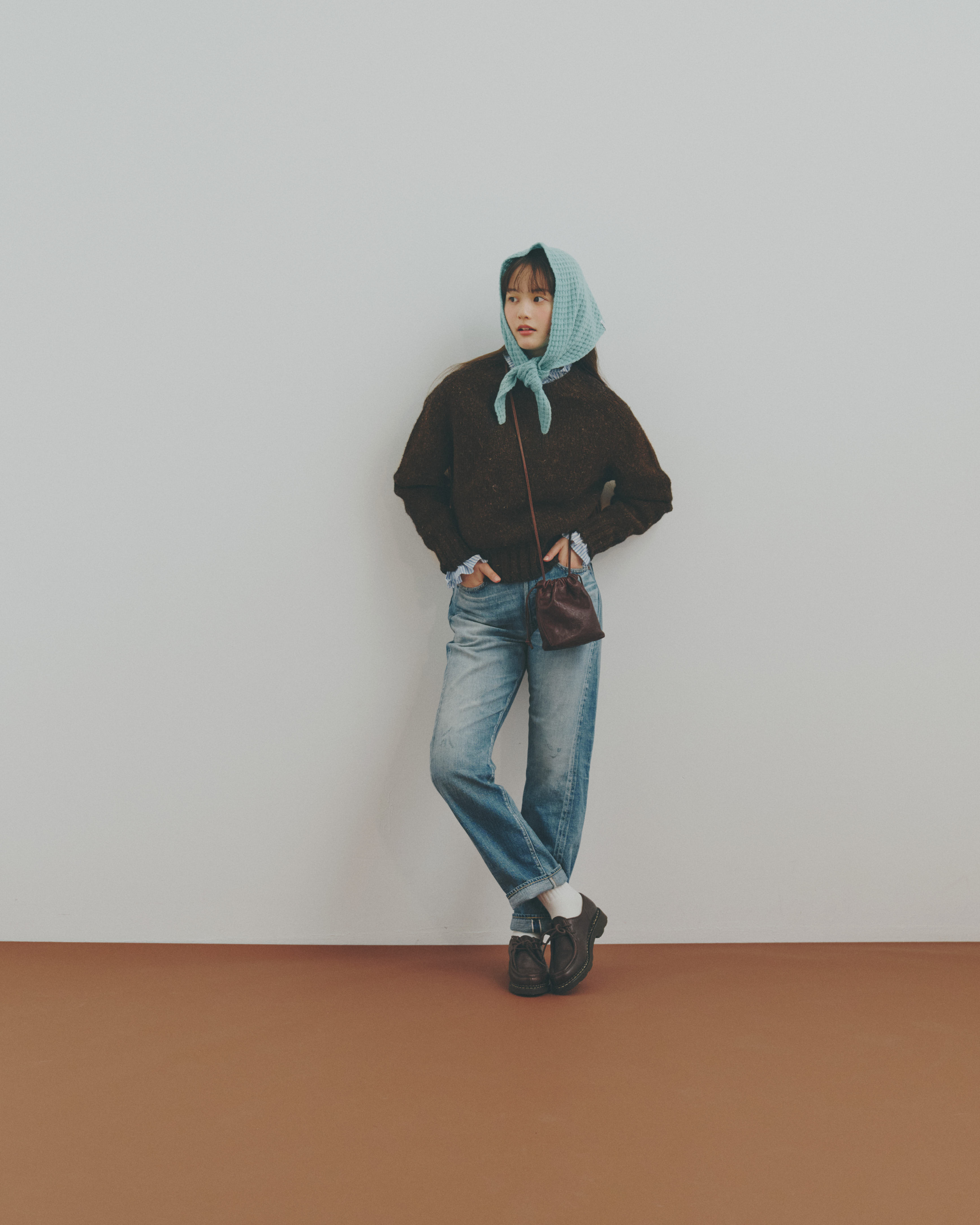 セーター¥45980 / MHL.(エムエイチエル.)、ブラウス¥36300 / Nigel Cabourn WOMAN(アウターリミッツ)、スカーフ¥13200 / elegancese(ティータイム)、デニム¥40480 / FULLCOUNT(フルカウント)、バッグ¥42900 / IL BISONTE(ルック D.C事業部)、ソックス¥1210 / 靴下屋(タビオ)、シューズ¥94600 / Paraboot(パラブーツ青山店)