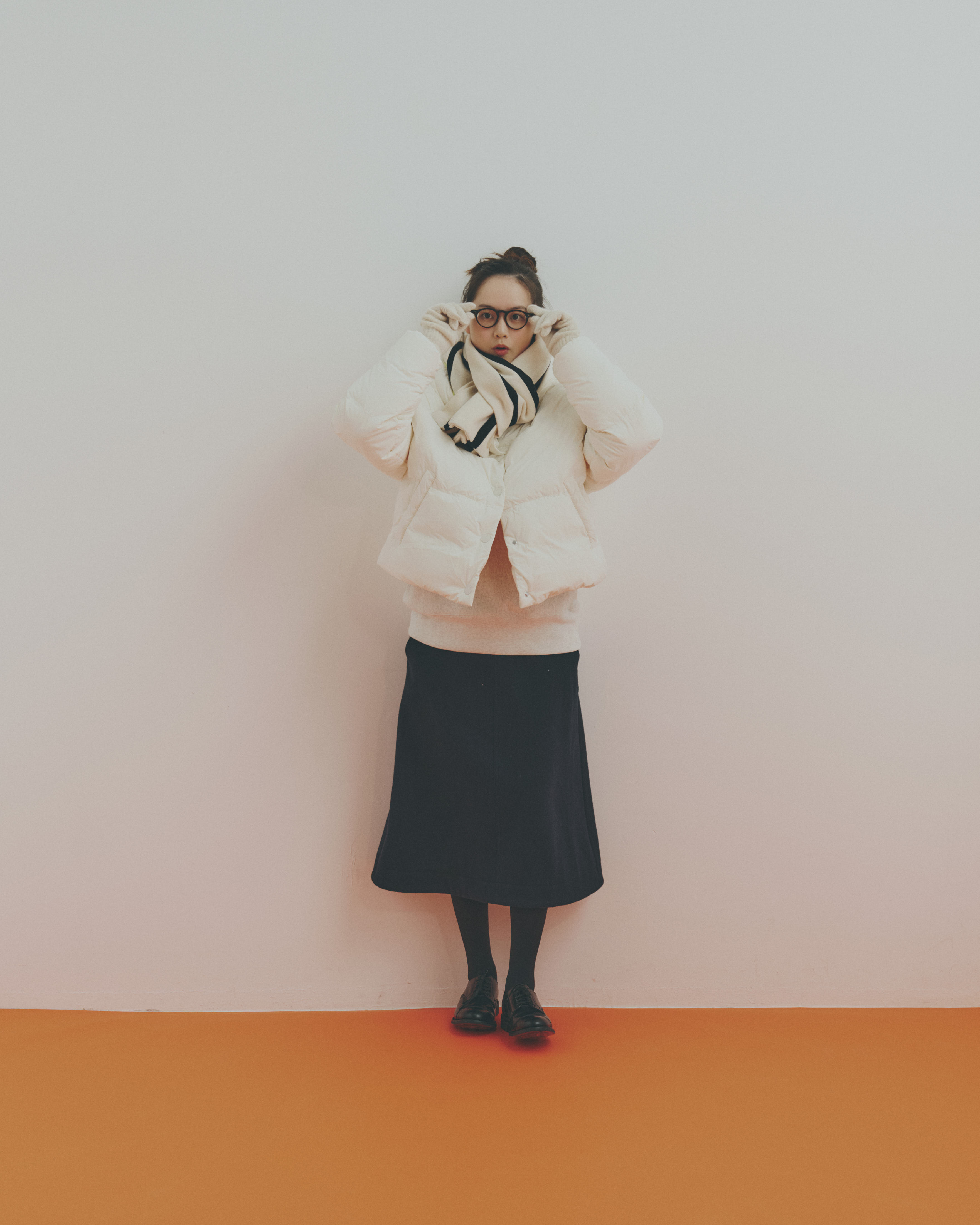 ジャケット¥33000 / Wilson(アメアスポーツジャパン・ウイルソンお客様センター)、スウェットシャツ¥10780 / Champion(ヘインズブランズ ジャパン カスタマーセンター)、スカート¥38940 / MHL.(エムエイチエル.)、マフラー¥14300 / A.E.Clothier(グラストンベリーショールーム)、メガネ¥54780 / Oliver Peoples(ルックスオティカジャパン カスタマーサービス)、手袋¥14300 / Joshua Ellis(真下商事)、タイツ¥1320 / 靴下屋(タビオ)、シューズ¥68200 / SANDERS(サンダースジャパン)