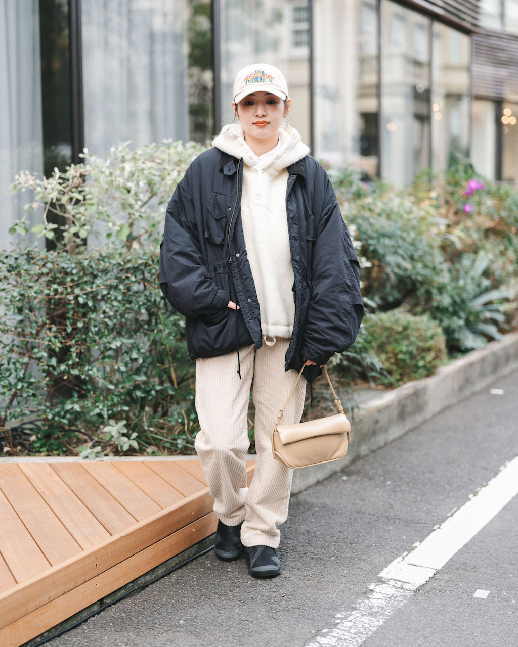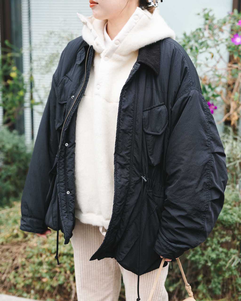 ホワイト系のパーカ&ボトムをブラックのアウター&スニーカーで引き締めたシックなモノトーンコーデ。色がシンプルだからこそもこもこの素材感で抑揚を出すのがポイント。