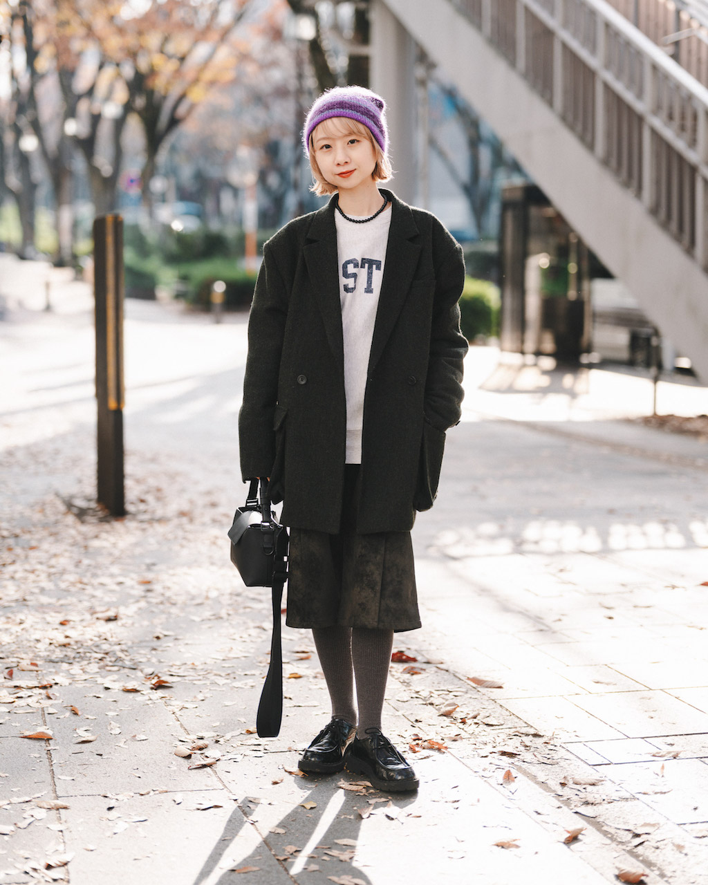 ▶︎ビックシルエットのジャケット×ハーフパンツが新鮮!パープルのビーニーでアクセント