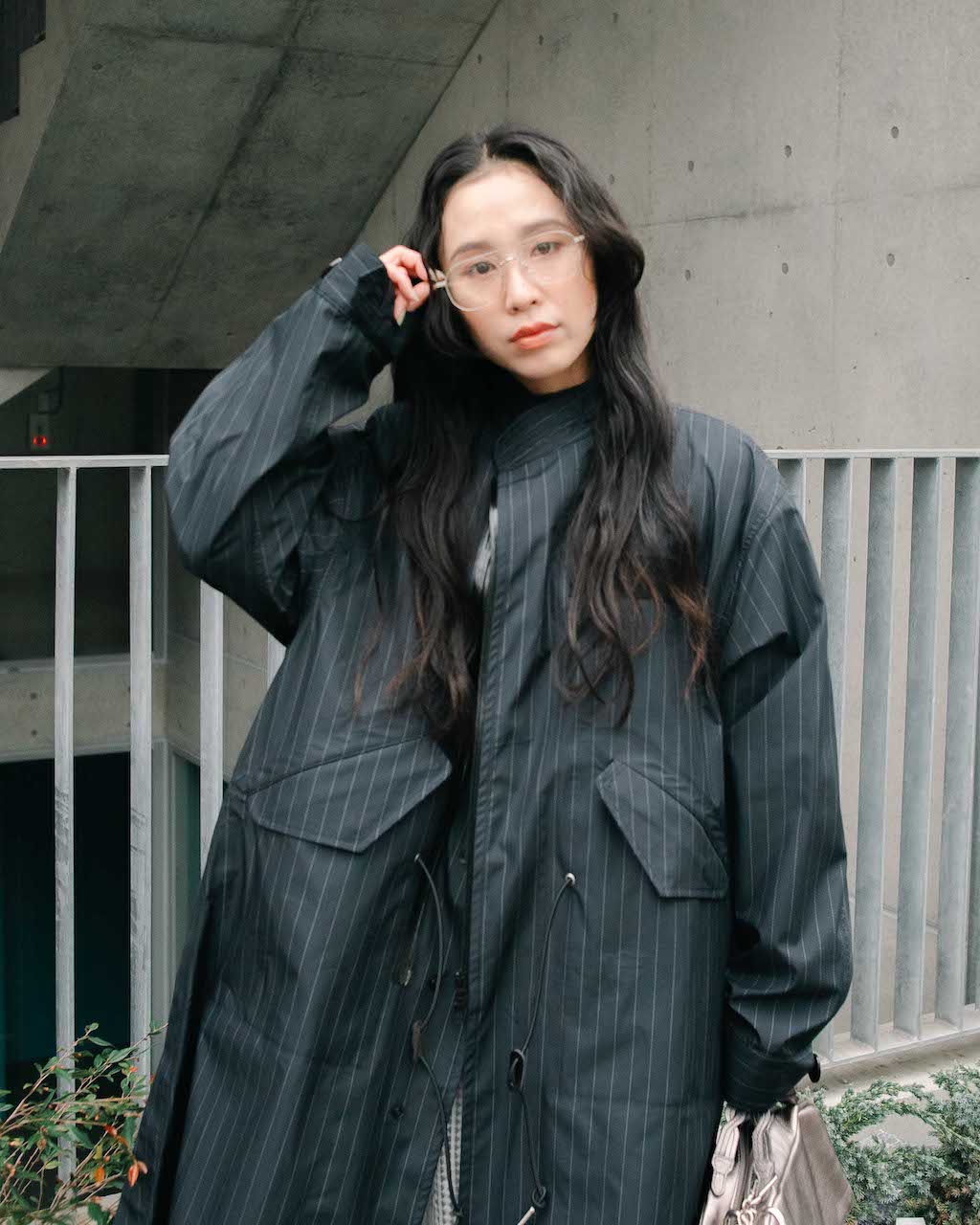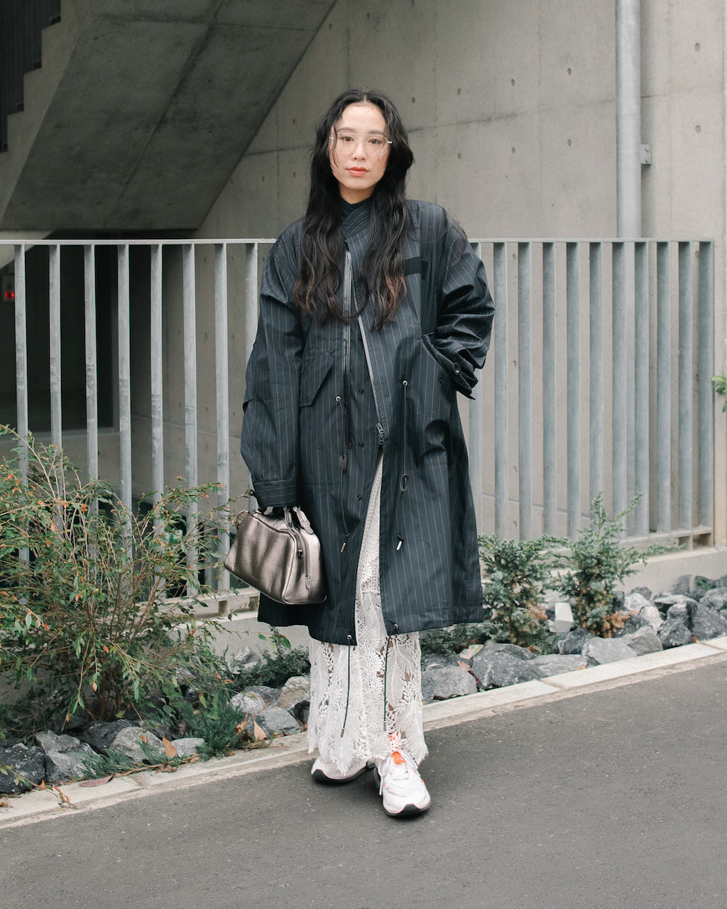 ストライプ柄が男前なコートからレーススカートをのぞかせて、ほどよいMIX感を演出しよう。シルバーのメガネやバッグで華やぎを、スニーカーでアクティブさを取り入れて。
