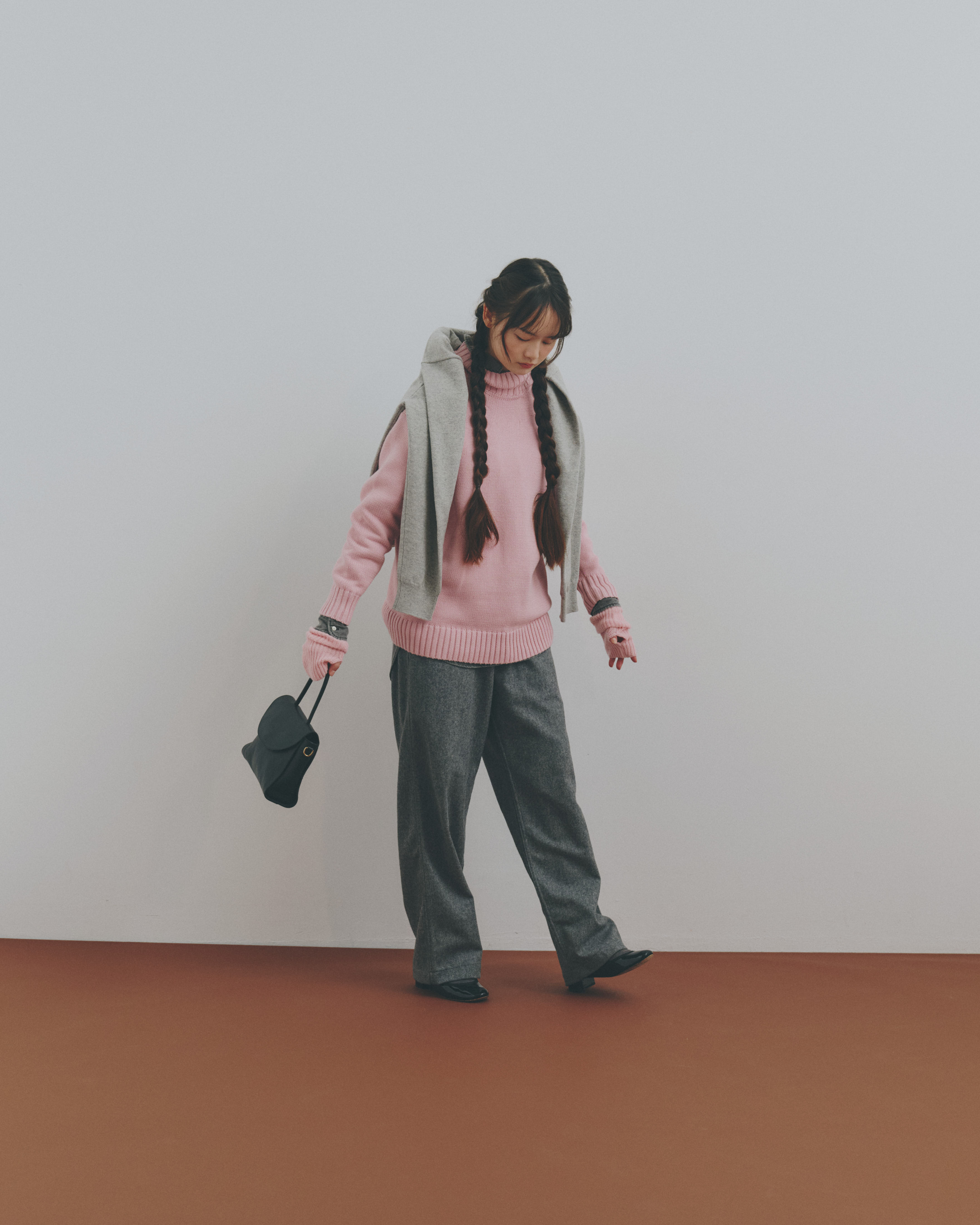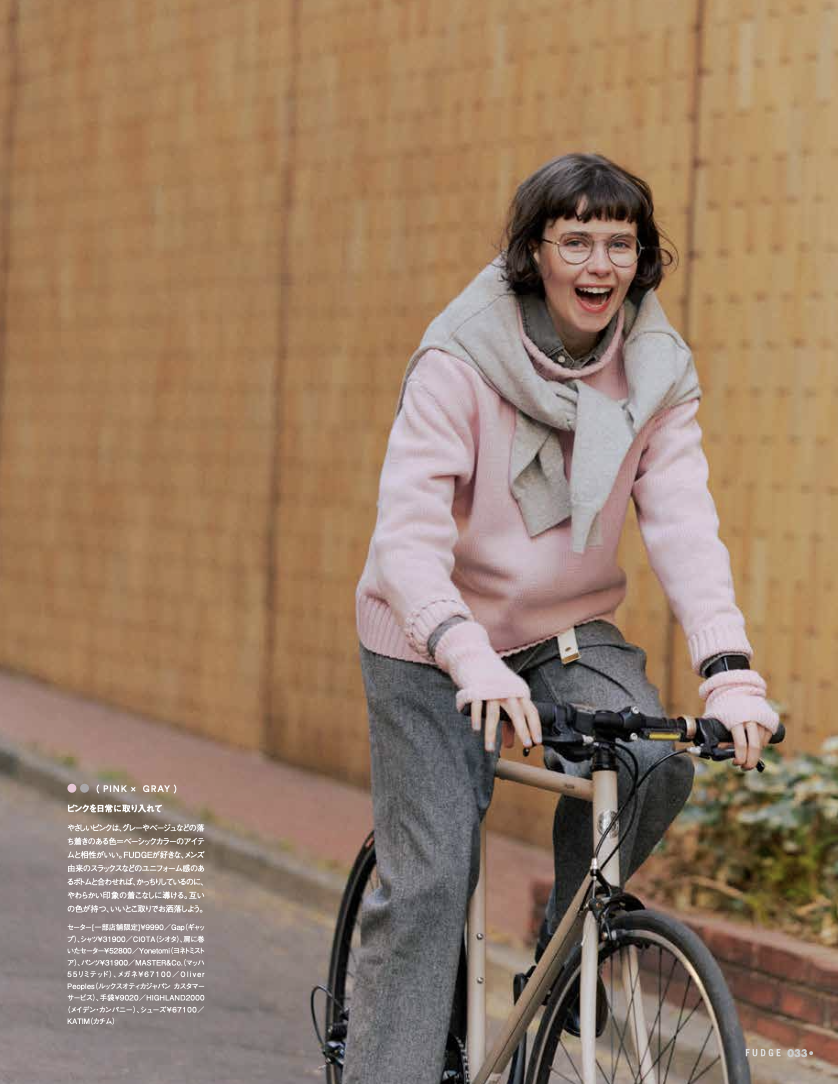 やさしいピンクは、グレーやベージュみたいな穏やかな色と合わせると、ぐっとなじみがよくなる。FUDGEらしい、メンズライクなスラックスやユニフォーム感のあるボトムと組み合わせれば、きちんと感はそのままに、どこかやわらかな空気をまとった着こなしに。色とシルエット、それぞれのいいところを重ねて、自分らしいバランスを楽しんで。