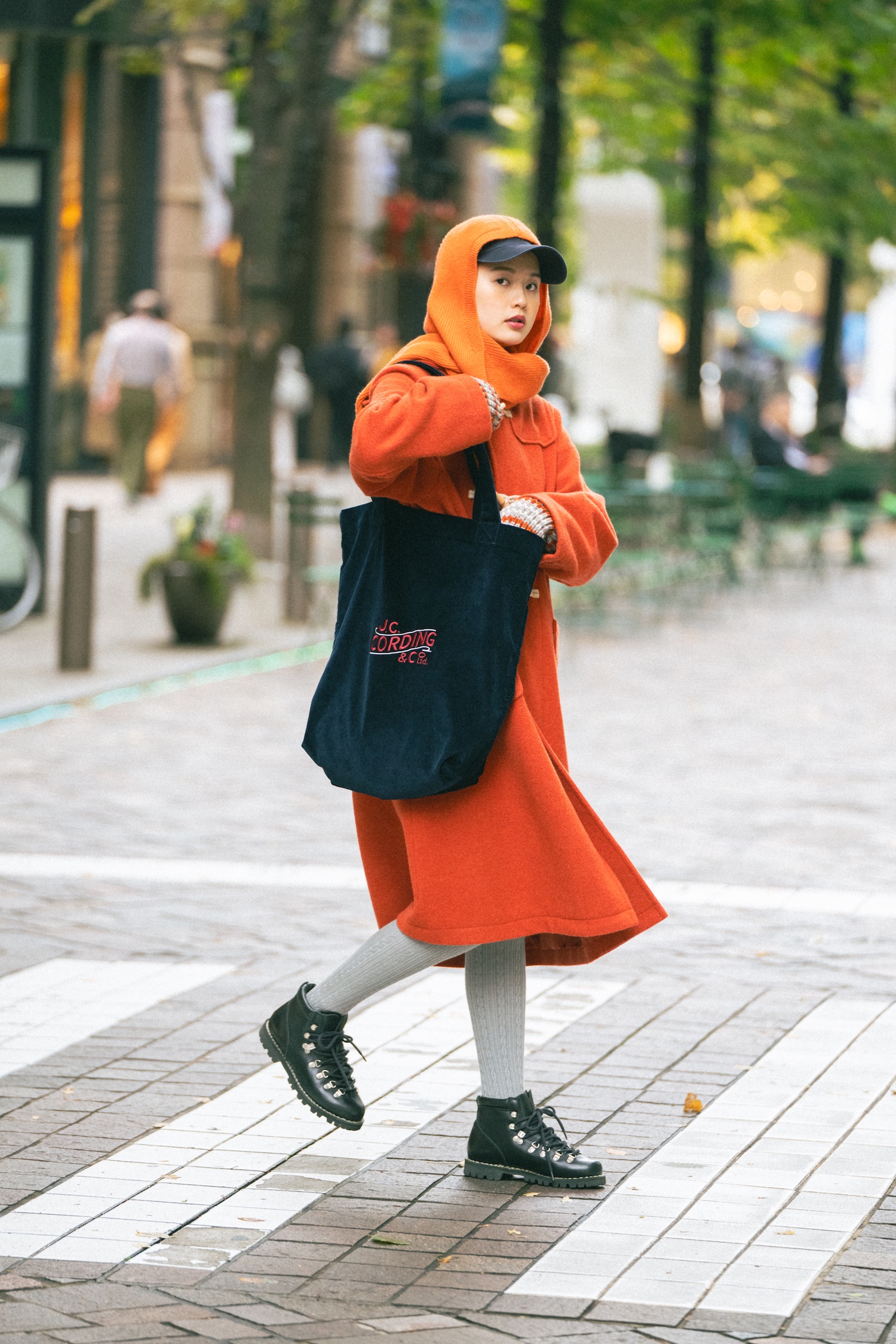 暗い色になりがちな冬はオレンジでエナジーチャージをするそう。頭を覆うことで寒さを軽減できるらしいので、キャップの上にバラクラバを重ねて、お洒落に防寒。この季節だからこそ楽しめる、あったかオレンジ×ネイビーの組み合わせには、黒やグレーで引き締めよう。