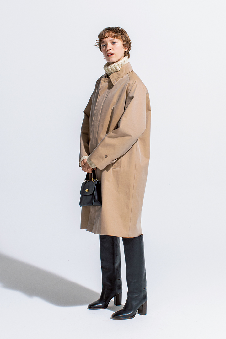 とにかくシルエットがきれいなバルマカーンコートは、ワンピース風に着ても素敵。ロングブーツと小さなバッグを合わせれば、レディなムードも高まります。