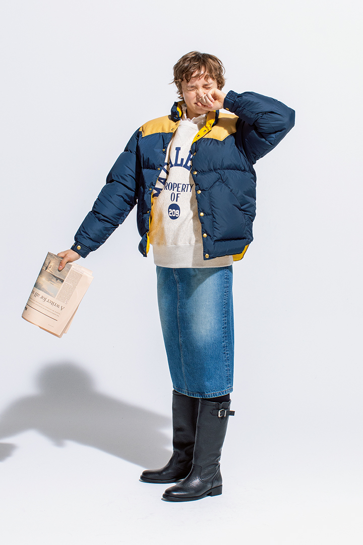 トップスはセーターにダウンジャケットを2枚重ねて。ボトムはダウンスカートとダウンパンツでデニムパンツをサンドイッチ 。ダウンアイテムと色のハーモニーを楽しもう。