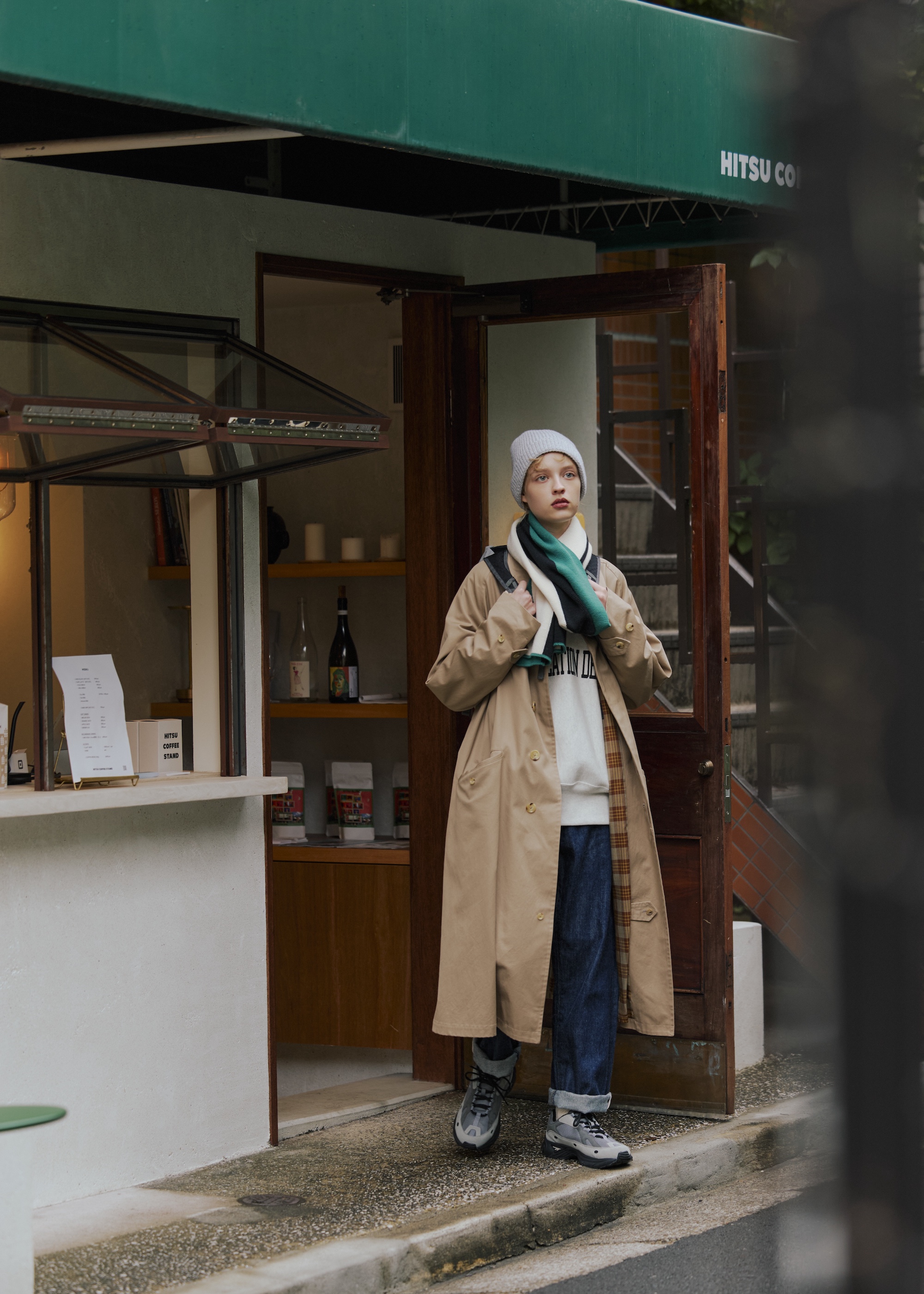 しなやかなタッチで上品さもあるコートだからこそ、スウェットとデニムのラフな組み合わせがちょうど良い。トリコロールのマフラーで暖かみとアクセントカラーを加えて。足元のハイテクシューズがよりこなれ感を引き出してくれる。