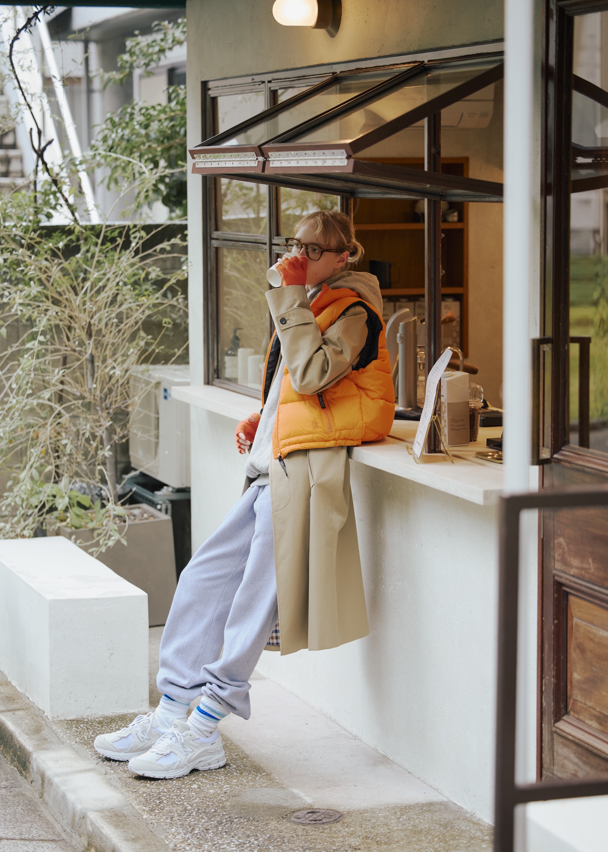 オーセンティックなデザインのコートだからこそ、ダウンベストやスウェット上下で組み合わせて、ラフに着るのがちょうど良い。オレンジを効かせながら、ベージュの存在感をしっかりと感じさせてくれる。