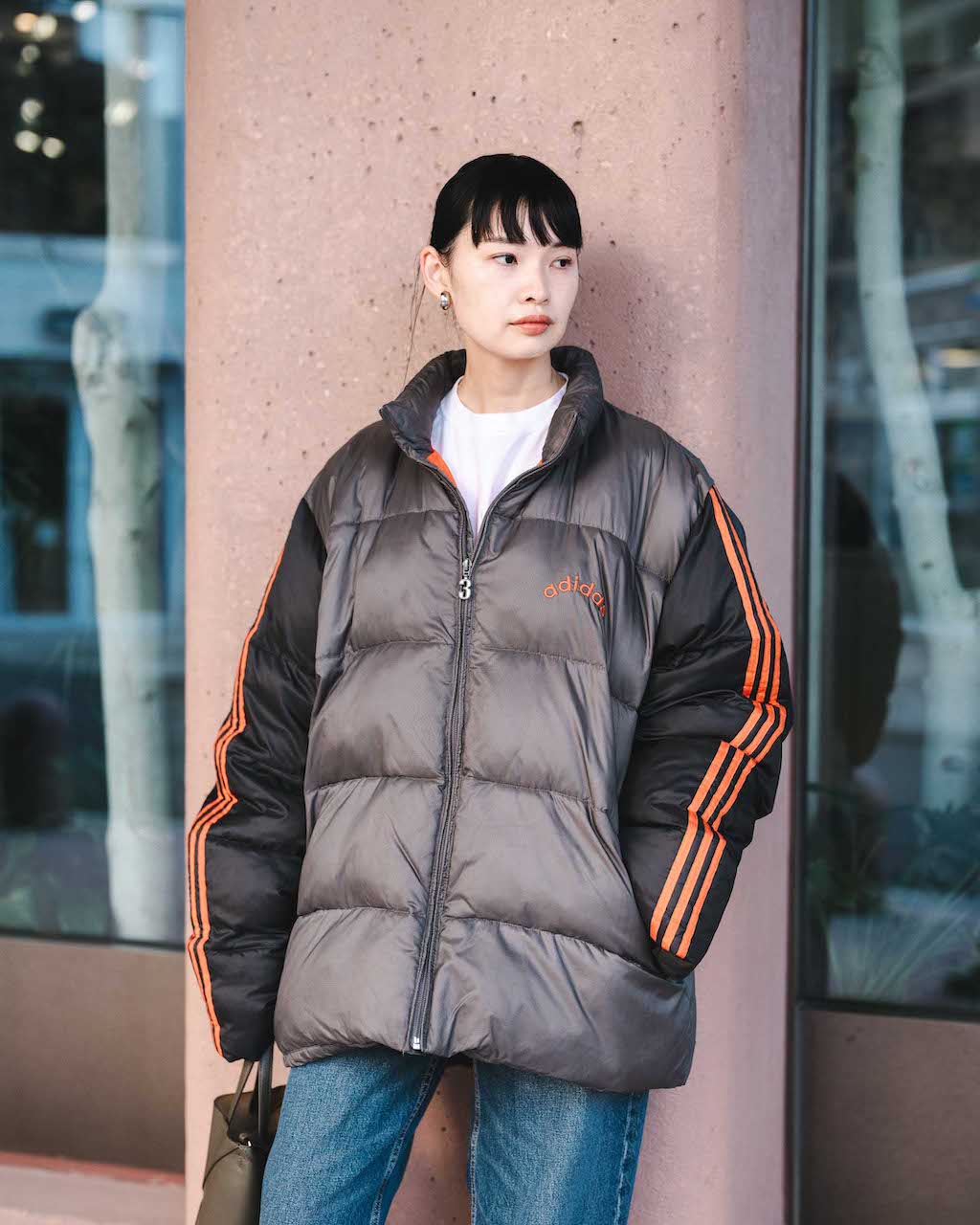 今季トレンドのスポーティなダウンを主役に、デイリーなデニムで気負わないスタイルに落とし込む。男前な印象がかっこいいオーバーサイズも今っぽく見せるポイント。
