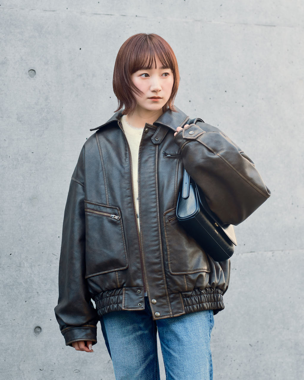 コーディネート4:レザージャケットはざっくりサイズで鮮度を上げて