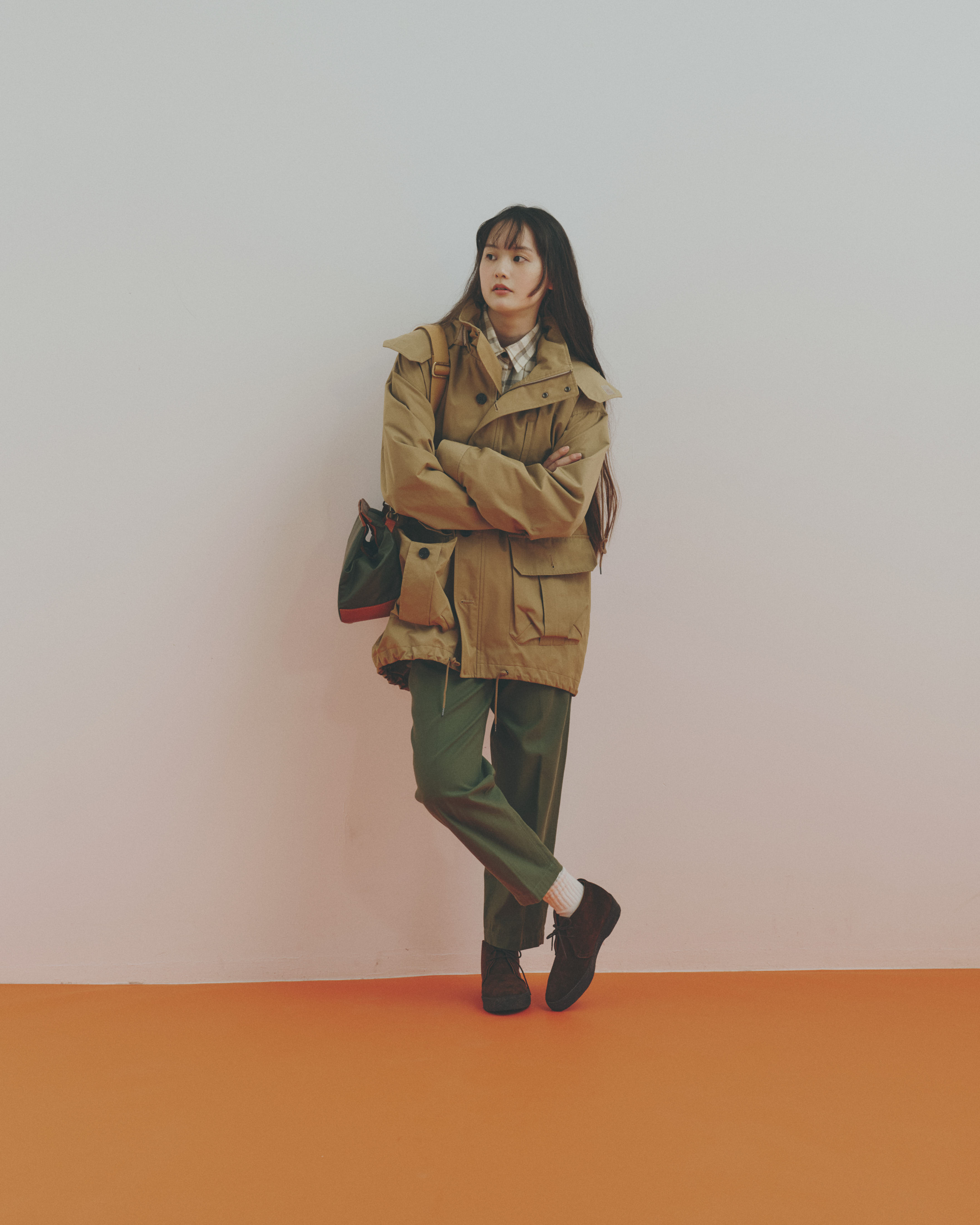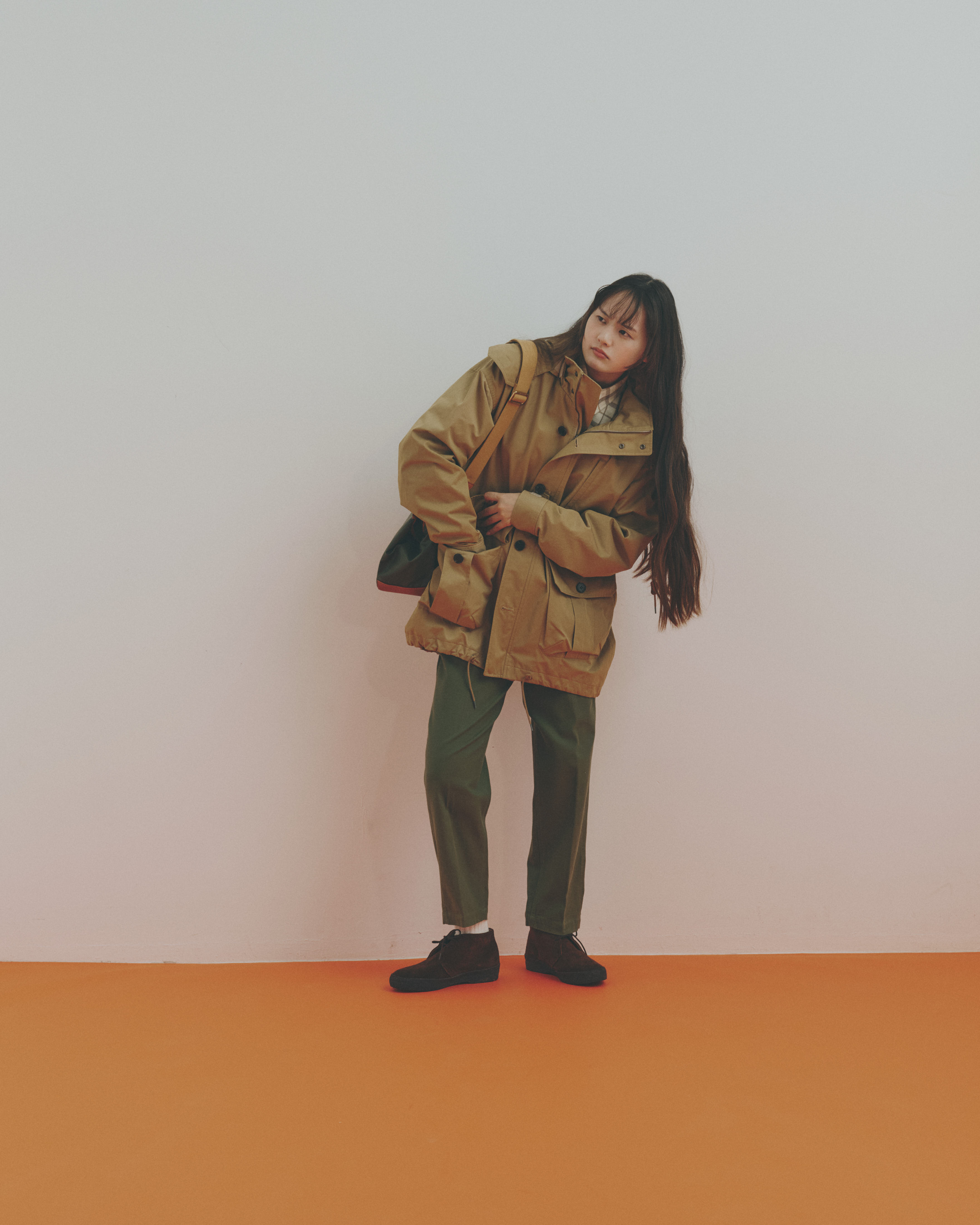 カーキのパンツにベージュのアウターを重ねたバイカラースタイル。 きちんと感のある色合わせに、ワークっぽいシルエットを重ねて、まじめすぎないバランスに。小物選びでちょっぴりオンクルムードな漂わせるとGOOD。足元やバッグもどちらかの色に寄せて、色数は増やさず、すっきりまとめて。