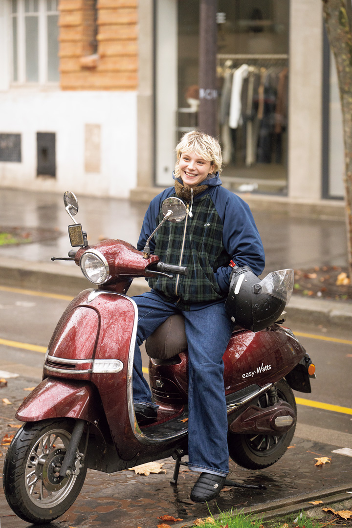 「まるで親友みたいな存在で、ずっと一緒にいるんだ! 」と、Nineが嬉しそうに教えてくれたのは、フランス・ブルターニュで誕生した《easy-Watts》の電動スクーター。学生の頃からアルバイトでコツコツ貯金し、18歳の誕生日に自分へのプレゼントとして買ったのだそう。モーター音は静かで、狭い路地もスイスイ抜けられる。それにパリでは電動スクーターの駐輪が無料なこともあって、「本当に買ってよかった」と嬉しそう。そんな彼女はフォトグラファーとして駆け出したばかり。ポートフォリオを携え、相棒とパリの街を軽やかに巡っている。