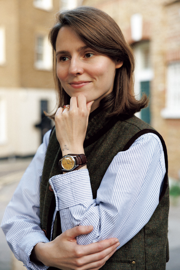 Barbaraの左腕には、宝物がふたつ。一見変わった形の時計は、革製品職人である彼が手づくりしたレザーベルトを合わせたもの。ヴィンテージの《OMEGA》を選ぶところから始めた、想いのこもった贈り物。「ベトナム旅行中、ハロン湾のボートの上でプロポーズされたの。その時に渡してくれたのが、この時計」。そして薬指に光る指輪は元々おばあちゃんのネックレスだったそうで、金を溶かしてリングにリメイクしたのだとか。エレガントすぎないデザインが、彼女の雰囲気にぴったり。どちらも世界にひとつ、彼女のためだけにつくられた宝物。
