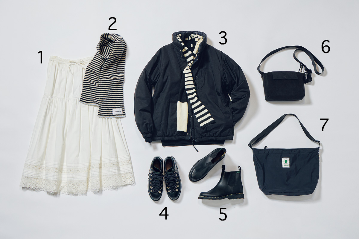 1_ スカート¥39600 / Bilitis dix-sept ans(ビリティス) 2 _ マフラー¥7700 / TEMBEA(テンベア トウキョウ) 3_ ブルゾン¥64900/ nanamica(ナナミカ D.W.S.)、セーター¥66000 / BATONER(バトナー)、マフラー¥3590 / ZARA(ザラ カスタマーサービス) 4_ ブーツ¥96800 、 5 _ブーツ¥92400 /ともにParaboot(パラブーツ青山店) 6_ バッグ[ H15 × W24 × D8cm ]¥22000 /THE NORTH FACE PURPLE LABEL(ナナミカ マウンテン) 7_ バッグ[ H29 × W41× D13 cm ]¥6600 / SIERRA DESIGNS(アリガインターナショナル)