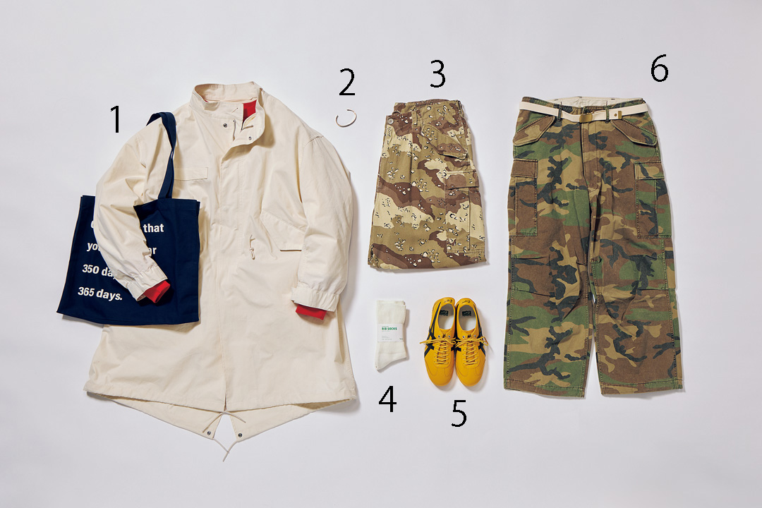 1_ コート¥14993 / FREAK’S STORE(フリークス ストア渋谷)、スウェットシャツ¥28600 / coupronde(アントリム)、バッグ[ H37 × W45 ×D5cm ]¥3190 / THREE FIFTY STANDARD( フェリシモ) 2_ バングル¥16500/ Studebaker Metals( グラストンベリーショールーム) 3_ パンツ[ 参考商品]/FREAK’S STORE(フリークス ストア渋谷) 4_ ソックス¥1100 /靴下屋(タビオ) 5_スニーカー¥18700 / Onitsuka Tiger(オニツカタイガージャパン) 6_ パンツ[ ベルト付き]¥28380 / MASTER&Co.(マッハ55 リミテッド)