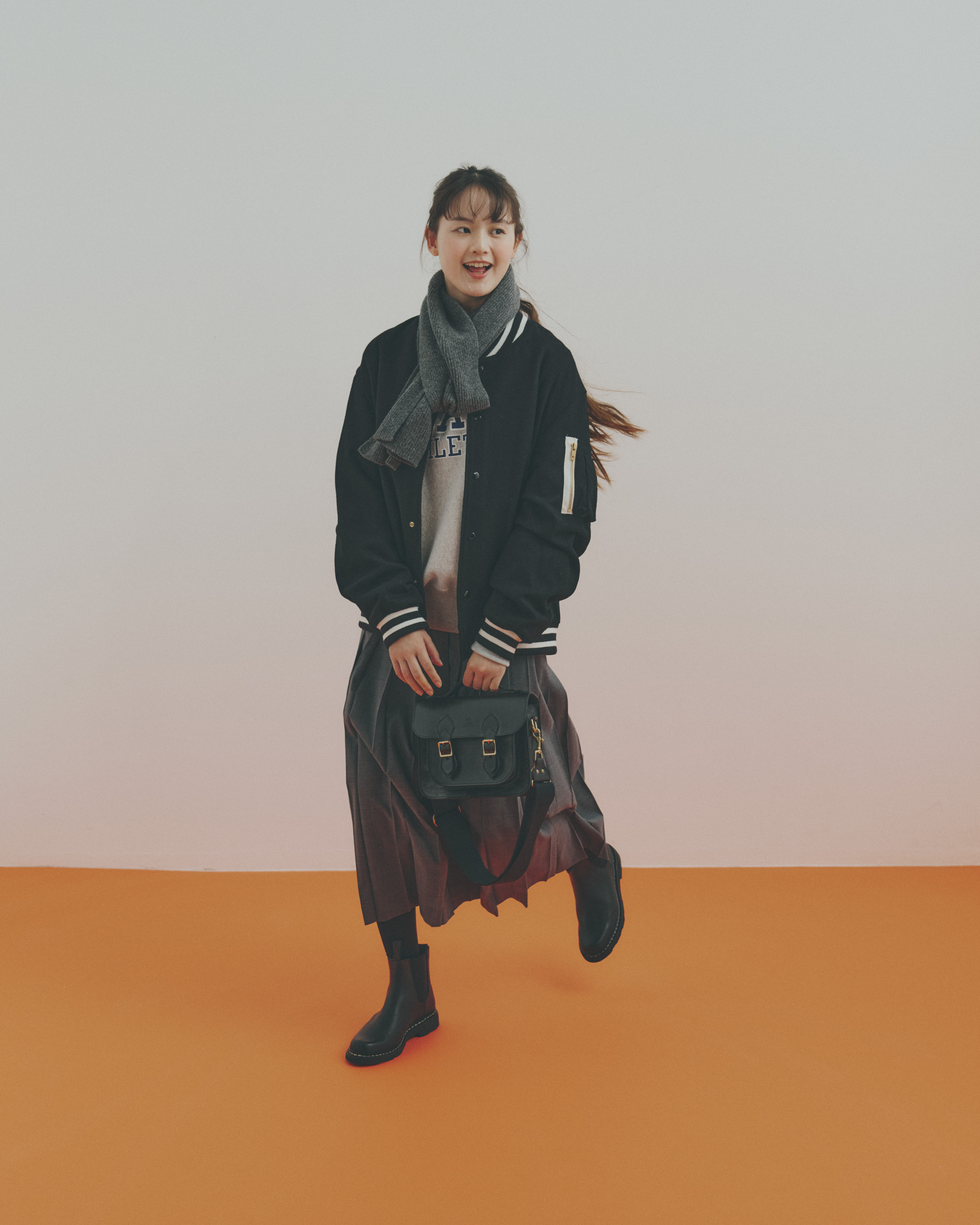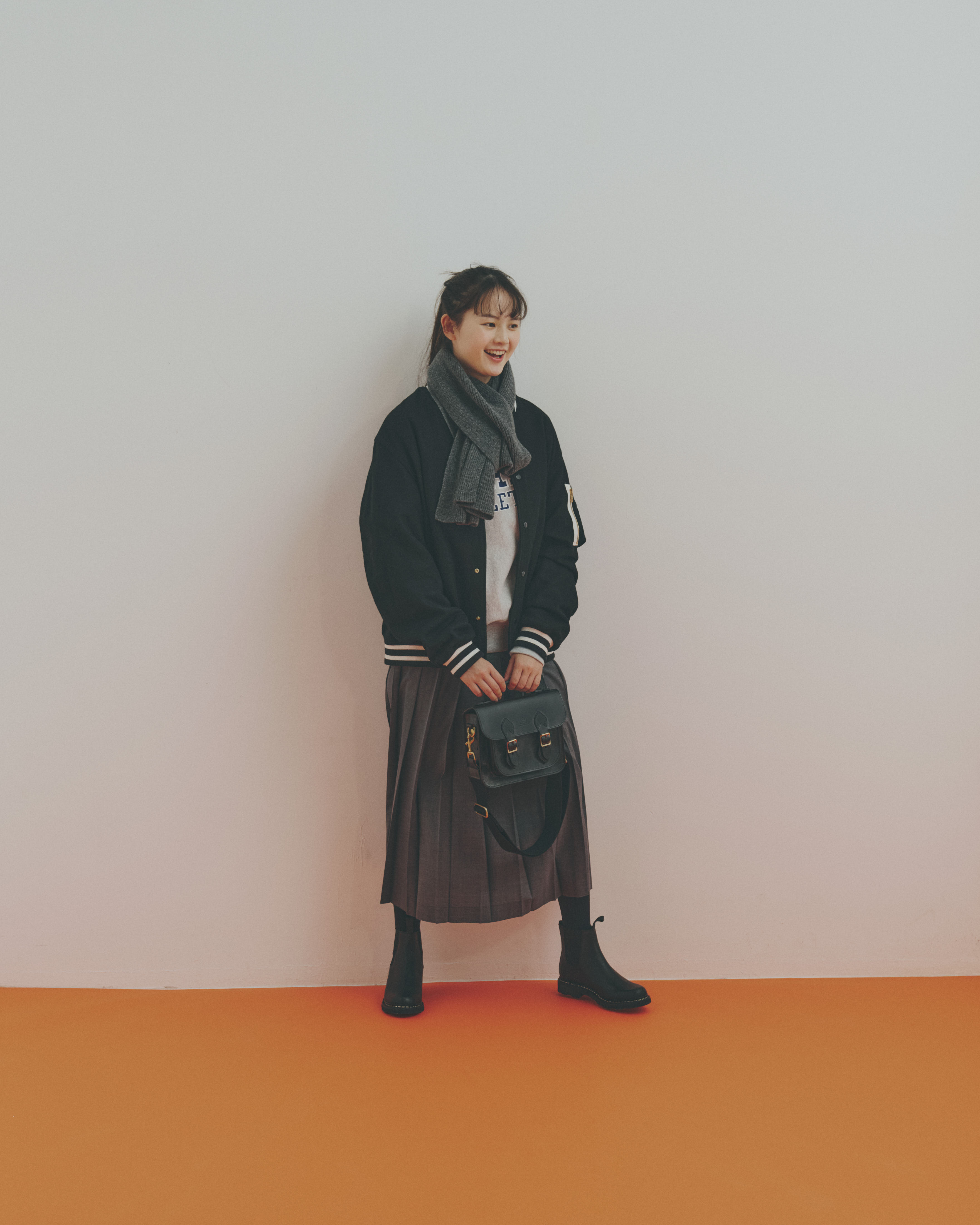 ブルゾン¥52800 / MASTER&Co.、マフラー¥20900 / GREEN THOMAS(ともにマッハ55リミテッド)、スウェットシャツ¥14080 / Champion(ヘインズブランズ ジャパン カスタマーセンター)、スカート¥35200 / BRITISH MADE、バッグ¥110000 / GLENROYAL(ともにブリティッシュメイド 青山本店)、タイツ¥1320 / 靴下屋(タビオ)、ブーツ¥92400 / Paraboot(パラブーツ青山店)