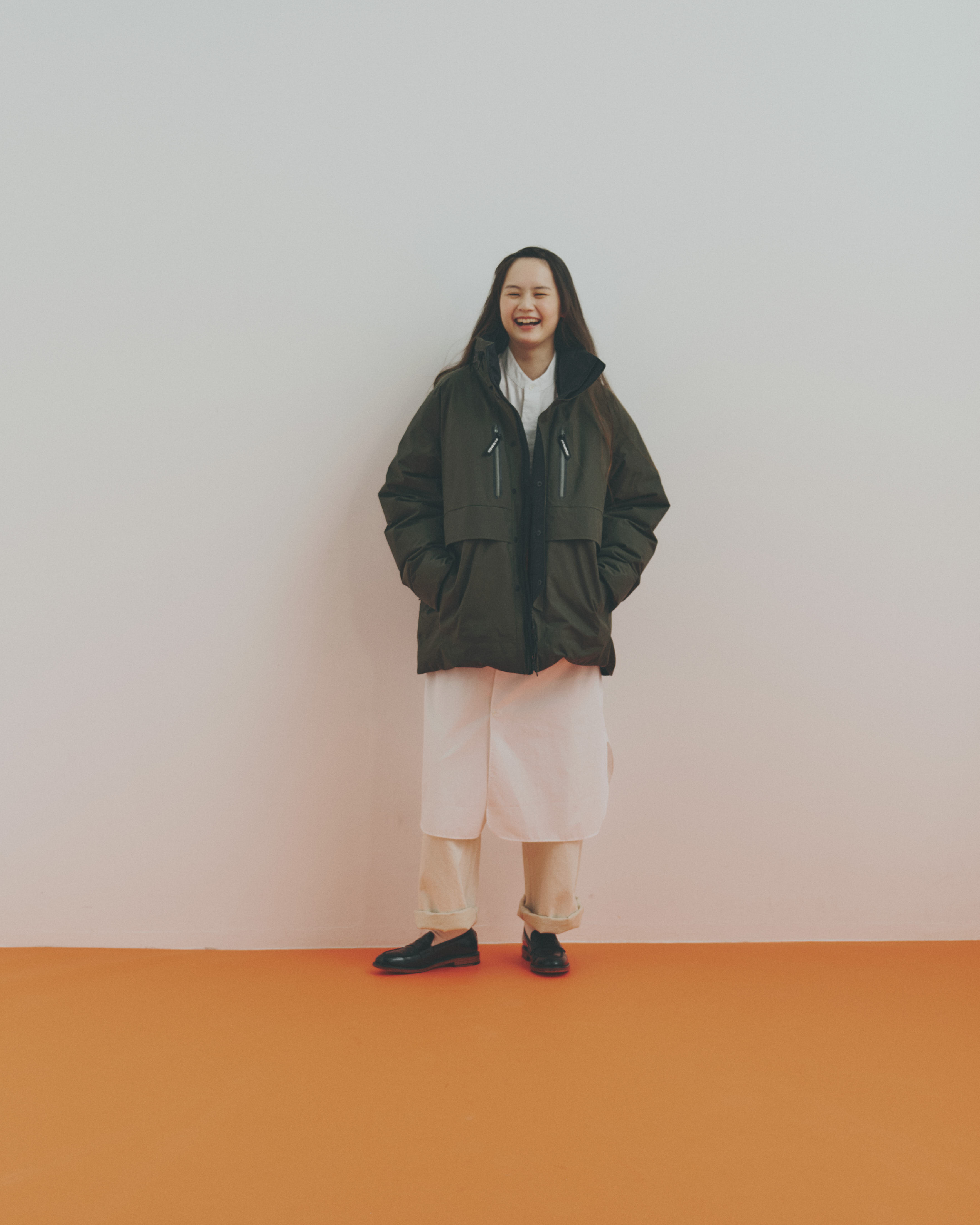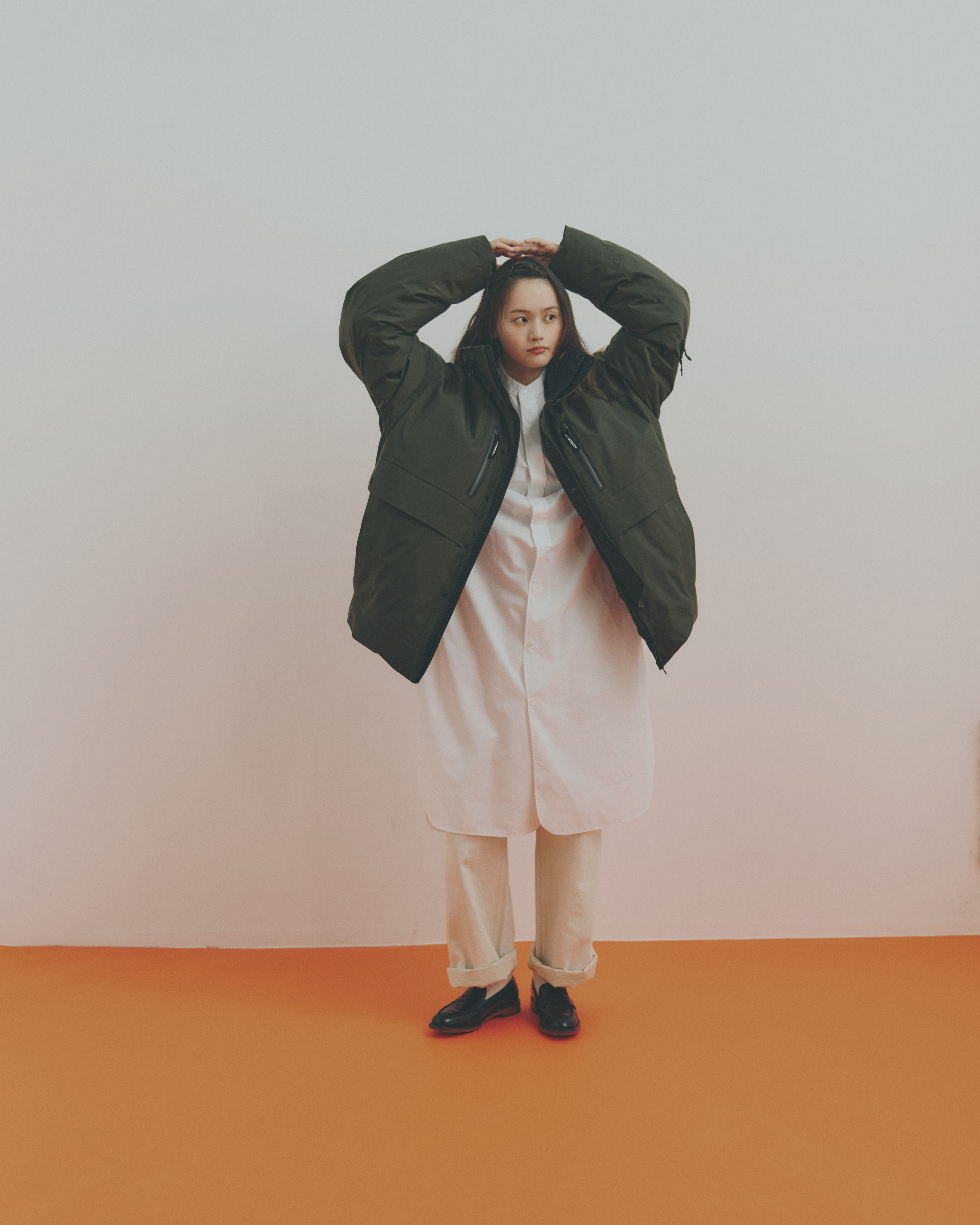 カーキのアウターに、ホワイトのシャツワンピースとパンツを重ねてバイカラーに。白は白でも、素材やトーンの異なる白を組み合わせることで、着こなしに自然な奥行きが生まれます。