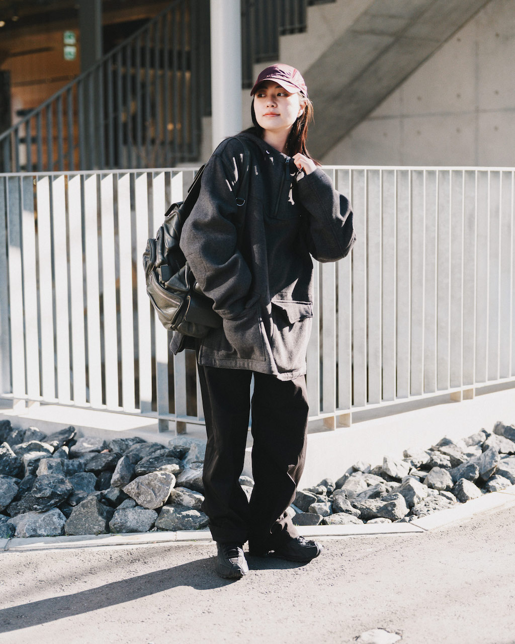 ダークグレーがクールなアウターとブラウンパンツは相性抜群。ダークトーンでまとめることで大人っぽい雰囲気に。明るめのブラウンキャップが顔周りを華やかに見せてくれる。