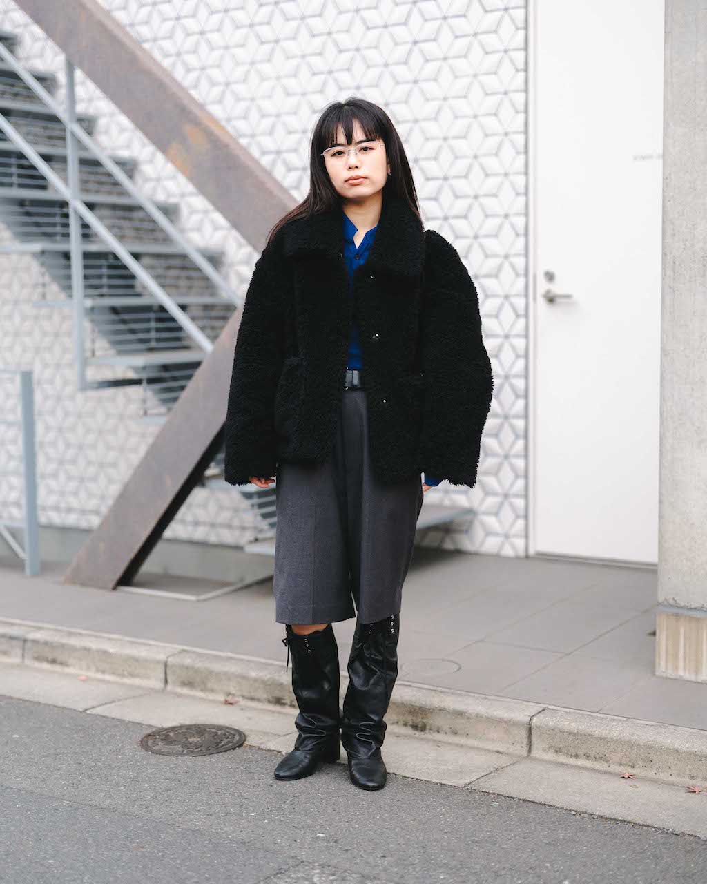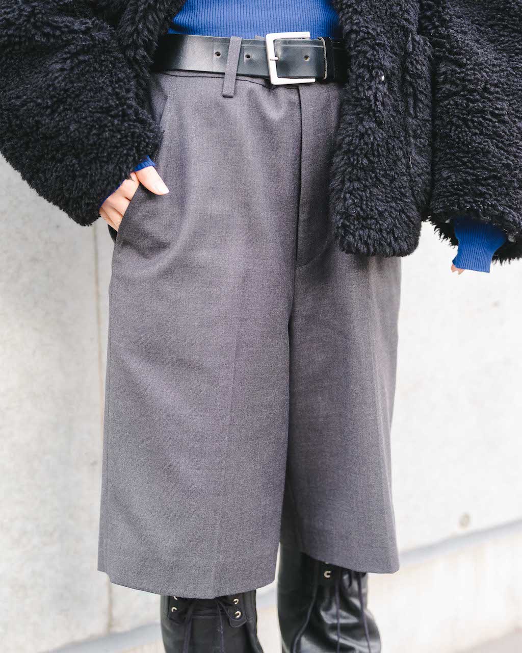 ブラックのもこもこアウターと淡いグレーのハーフパンツを合わせた装いは、素材感で抑揚をつけているのも秀逸。インナーのブルーがアクセントになったおしゃれな寒色コーデ。