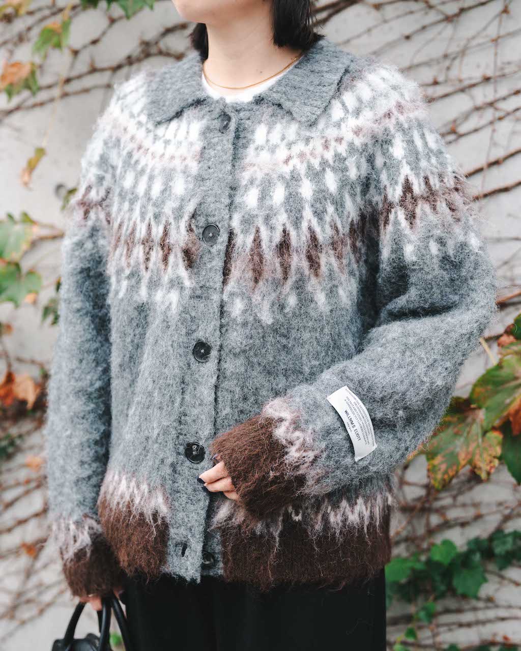明るいグレーをベースに白やブラウンの配色が素敵なフェアアイル柄ニットは、1枚でも存在感大。シックなブラックパンツや黒小物で引き締めて、主役ニットを引き立てよう。