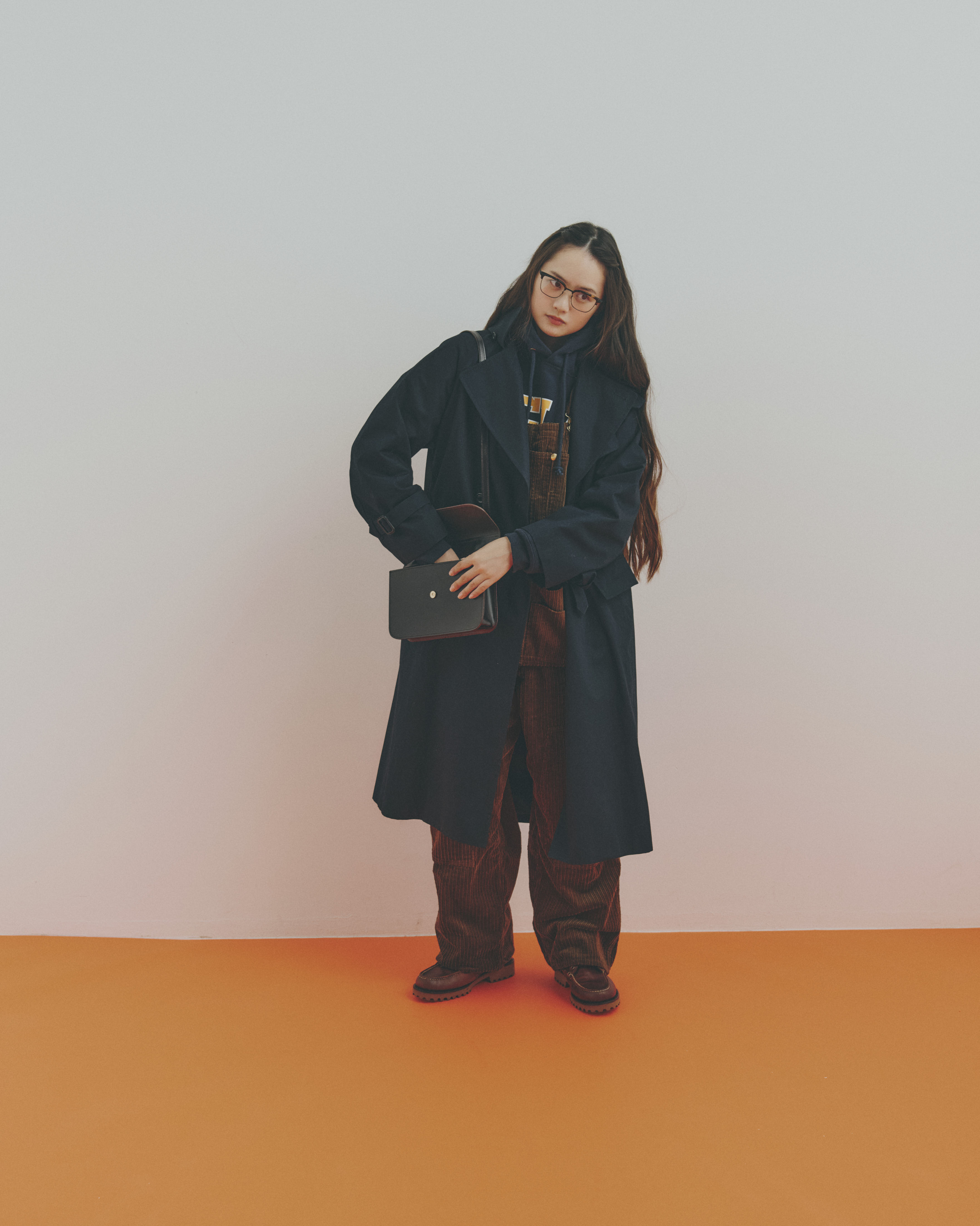 コート¥90200 / BRITISH MADE、バッグ¥78100 / GLENROYAL (ともにブリティッシュメイド 青山本店)、フーディ¥30800 / Champion(ヘインズブランズ ジャパン カスタマーセンター)、オーバーオール¥52800 / MASTER&Co.(マッハ55リミテッド)、メガネ¥84700 / Oliver Peoples(ルックスオティカジャパン カスタマーサービス)、ブーツ¥27500 / L.L.Bean(エル・エル・ビーンカスタマーサービスセンター)