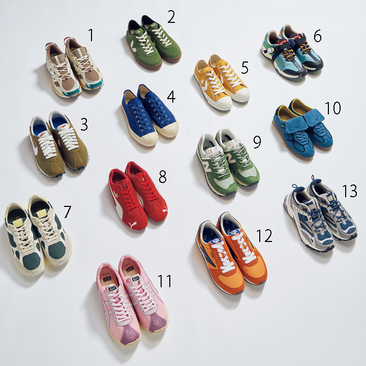 1_トレイルランニングの機能性と現代的なデザインを融合させた「ウエーブ ムジン ティーエル」シリーズから、スエードを使用したモデルが登場。直営店限定カラー。¥19250 / Mizuno(ミズノお客様相談センター)2 _サッカーシューズから着想を得たモデル「パンネンカ」。アッパーはオールスエードで、発色がよくも落ち着きのある絶妙なグリーンが素敵。¥27500 / VEJA(シードコーポレーション) 3_1977 年当時、ランナーをサポートするために広がった踵のクッショニングが画期的だと話題になった「LD-1000」。今では形状とワッフルアウトソールがレトロで可愛いと大人気。¥16060 / NIKE SPORTSWEAR(ナイキ カスタマーサービス) 4 _ 国内でもごく僅かな工場でしかつくられないヴァルカナイズ製法を採用したシリーズの1 足。丈夫で、シルエットも美しい。¥11000 / MOONSTAR(ムーンスター カスタマーセンター) 5_ 2024年に誕生50 周年を迎えた人気モデル「ワンスター」の新作。マスタードイエローは、デニムとも相性ばっちり。¥6930/CONVERSE(コンバースインフォメーションセンター) 6_ デザイナーやキュレーター、ヴィンテージコレクターなど、さまざまな顔を持つショーン・ウォザースプーン氏とコラボレーションしたハイクシューズ。大きなストラップがフィット感を高めてくれる。¥30800 / Teva(デッカーズジャパン) 7_ ロサンゼルス発のフットウエアブランド《クレイ》のスニーカー「ズマ」。好ポイントなグリーンのメッシュ素材は、プラスチックごみをアップサイクルしたもの。¥33000 / CLAE(リーガル コーポレーション) 8_ ここ数年、人気が絶えない《プーマ》の「スピードキャット」。80 ~90 年代にかけてF1グランプリのドライバーが履いていた、耐火レーシングシューズがデザインベースって知ってた? ¥15400 / PUMA(プーマ お客様サービス) 9_「574」は、1988 年に登場したオフロードシューズ「576」のDNAを引き継ぐ、ロングセラーモデル。¥12980 /New Balance(ニューバランスジャパンお客様相談室) 10_ ブランケットステッチが入ったラップデザインが存在感たっぷり。ライニングがイエローなのもかわいい。¥39600/ALOHAS(アッシュ・ペー・フランス)11“ジャパンブランドとして、日本のものづくりの良さを伝えたい”、そんな想いからスタートした「ニッポンメイド」シリーズのスニーカー。モデル名は「モアル」。¥38500 / Onitsuka Tiger(オニツカタイガージャパン) 12 _ 2014 年にブランドの誕生40 周年を記念して、ロンドンのセレクトショップ〈エイソス〉とコラボレーションしたスペシャルモデルが2 度目の復刻。レトロなオレンジがいい感じ。¥8800 / HI-TEC(ムーンスター カスタマーセンター) 13 _ブランド独自の防水透湿機能“ オムニテック”、超軽量でクッション性に優れたミッドソール“テックライト”、さまざまな路面環境に順応するアウトソール“オムニグリップ”など、機能満載。¥22000 / Columbia(コロンビアスポーツウェアジャパン)