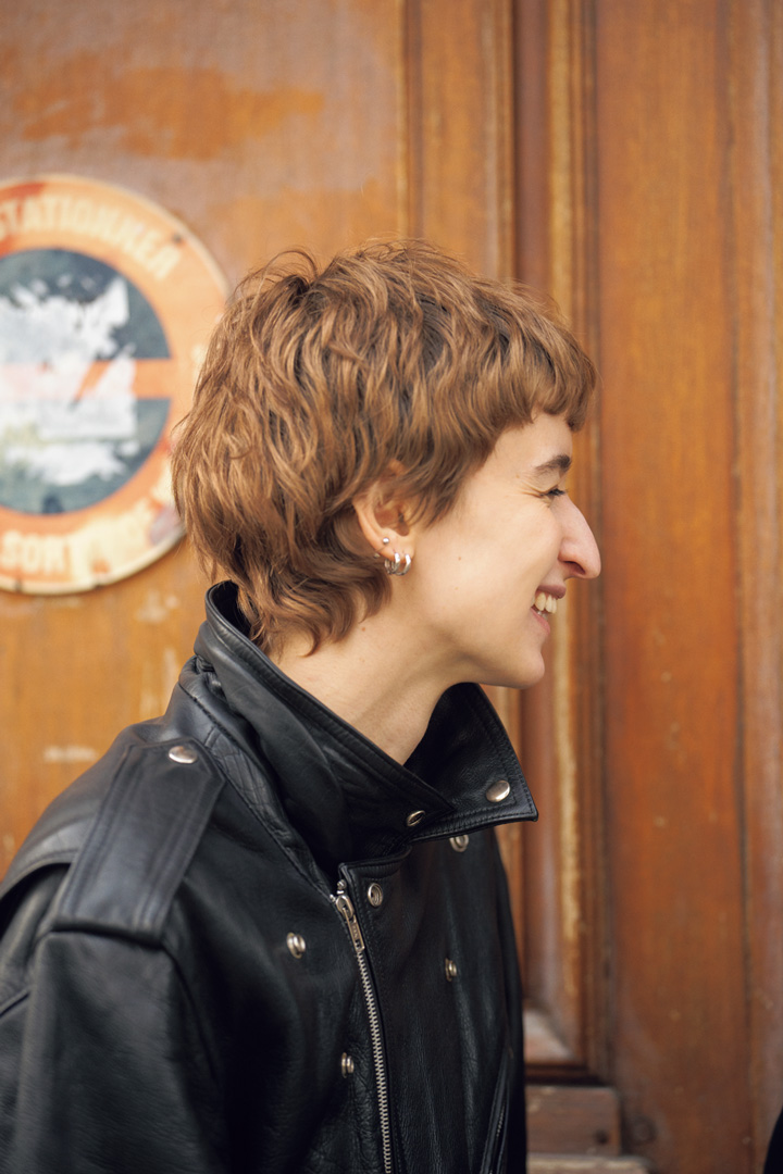 パリ・シックを体現するブランド《アミ パリス》で働くClémontine。ハードなライダーズジャケットにやわらかなシルエットのショートカットというのはまさに! な感じ。顔まわりからうなじまで続く絶妙なカットラインがとっても美しい。