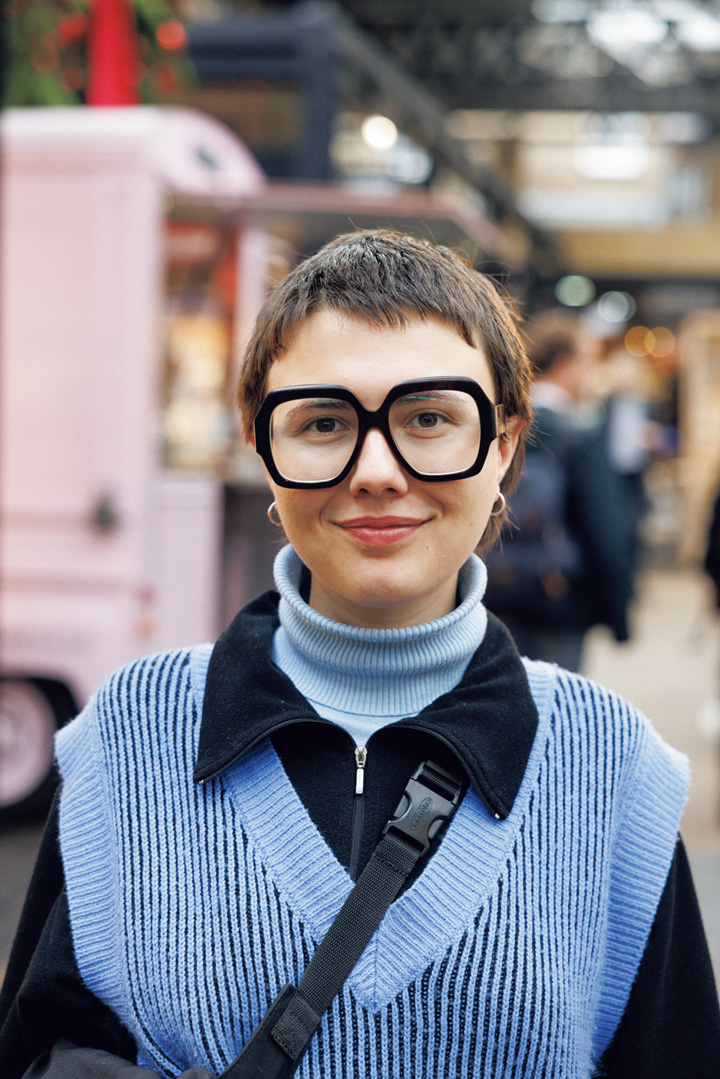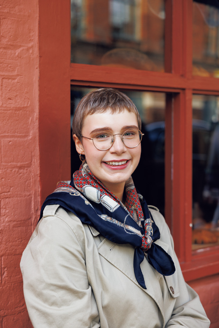 グランマ調メガネがよく似合っていた彼女。しっかりめに描いた眉と赤みのあるリップ、そして鮮やかなプリントのスカーフが、セシルカットにレディの要素をプラスしてエレガントな空気を演出。シンプルな輪っかピアスも効果的。