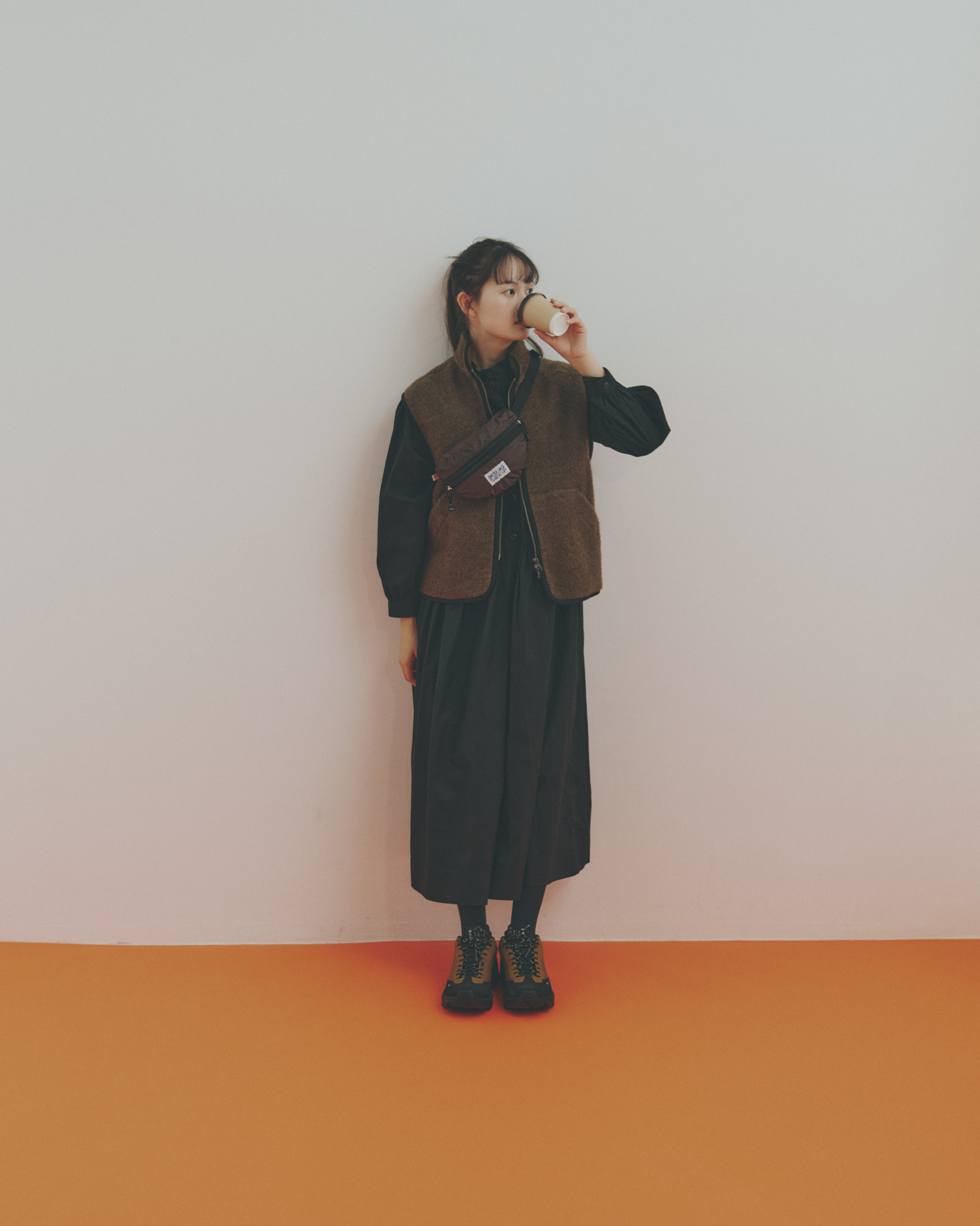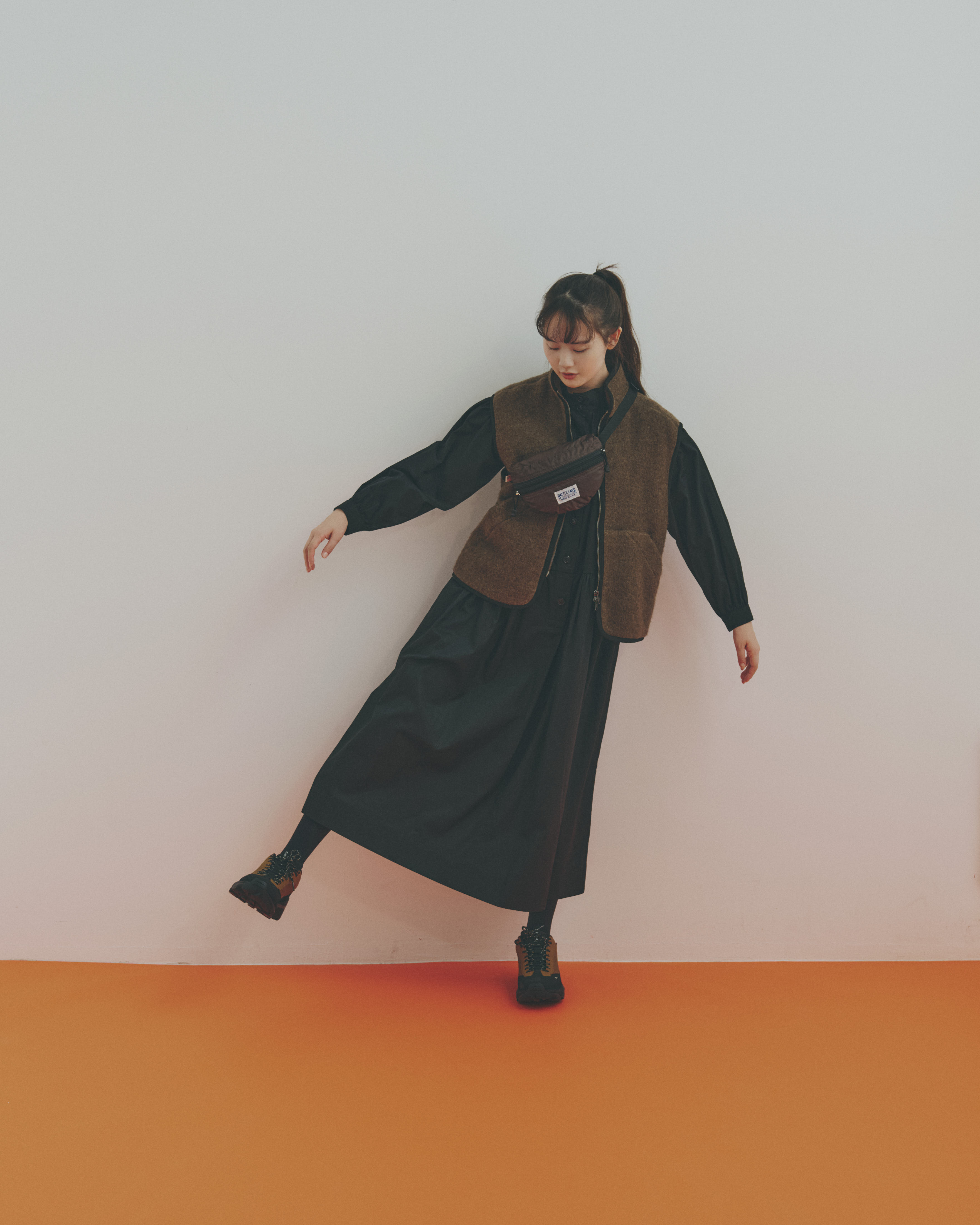 シックなブラックのワンピースを軸に、ブラウンのベストをレイヤード。色のコントラストは控えめでも、素材感の違いが奥行きをつくってくれるのです。黒の強さをブラウンがやわらかく受け止めて、どこか肩の力が抜けた表情に。コンパクトなウエストバッグで装いに軽快さと実用性をプラスしたら、足元はスニーカーで気負わずまとめるのがFUDGE流。