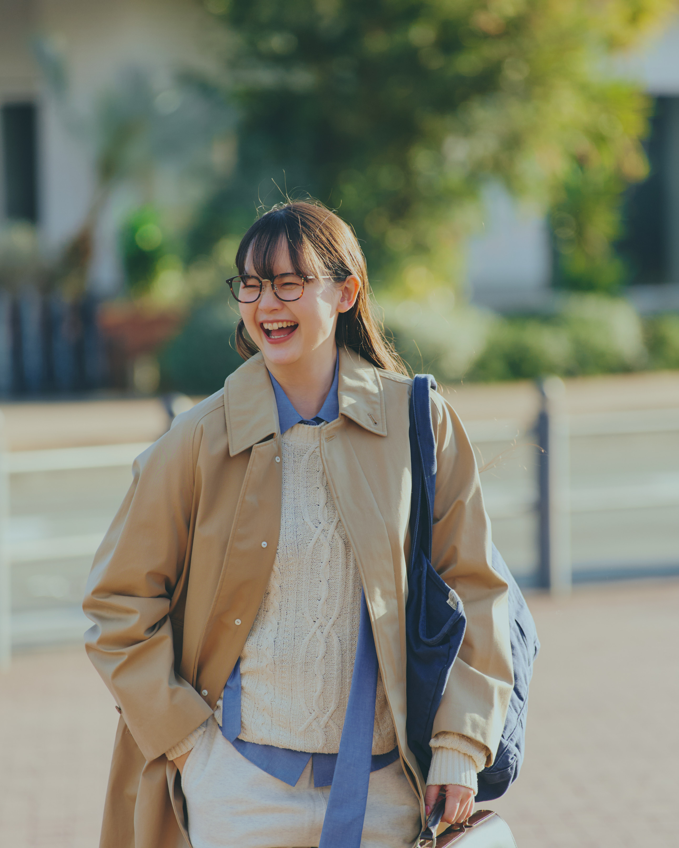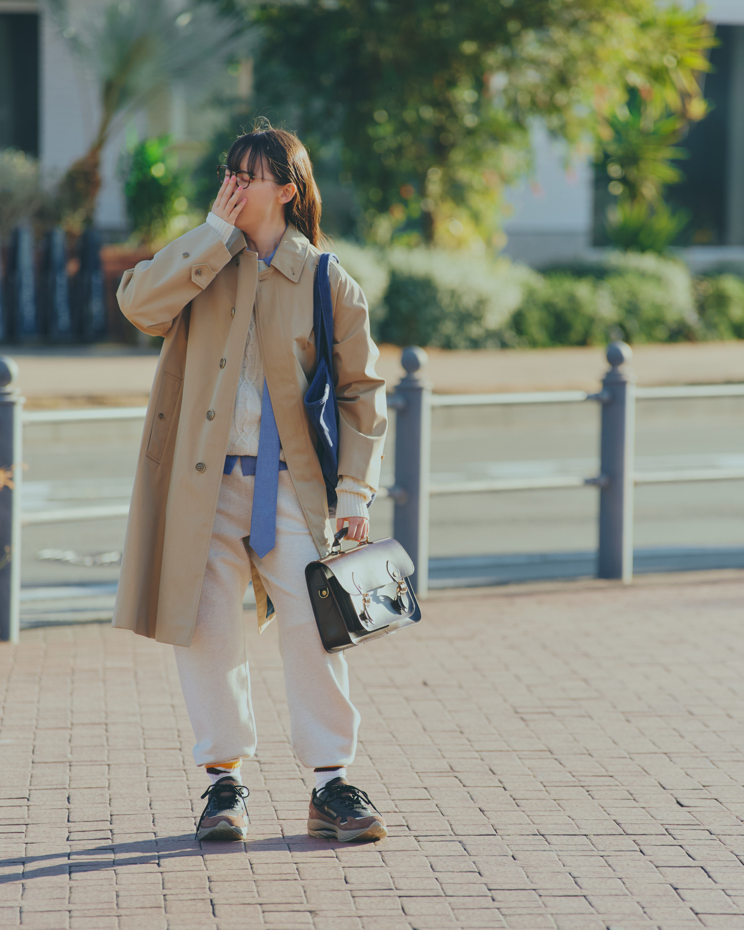 コート¥132000/nanamica(ナナミカ D.W.S.)、セーター¥49500/HERILL(にしのや)、シャツ¥18700/MIDIUMISOLID(マーコートデザインアイ)、スウェットパンツ¥308000/HYKE(ボウルズ)、メガネ¥49500/EYEVAN(アイヴァン 東京ギャラリー)、トートバッグ¥10450/TRIFFER(セムインターナショナル、バッグ¥93500/GLENROYAL(ブリティッシュメイド 青山店)、ソックス¥2860/THE RAILROAD SOCK(メイデン・カンパニー)、スニーカー¥26400/Mizuno(ミズノお客様相談センター)