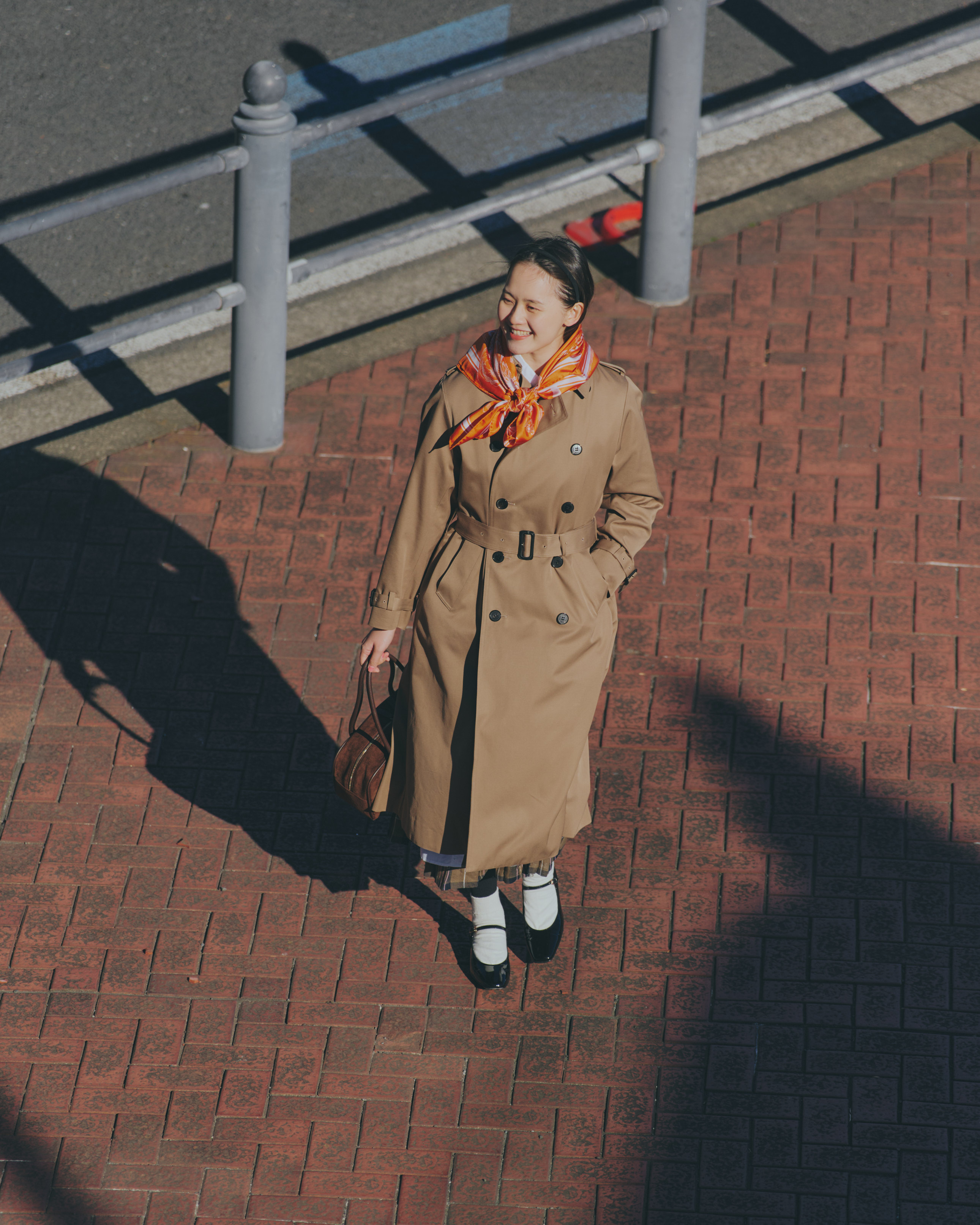 レディなスタイルのお手本は、憧れのパリジェンヌ。あの女優もあの映画でもやっぱりトレンチコートを羽織っている。スカーフの巻き方は大判のスカーフを三角にして前をきゅっと。チェックのプリーツをちょっと見せるのがポイント。キラっとしたパテントのストラップシューズで軽快に歩こう。