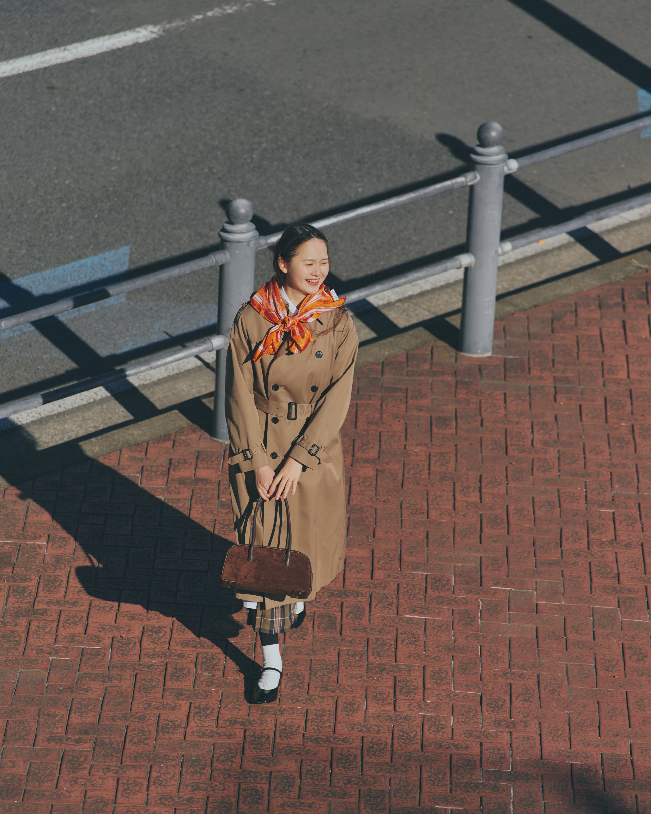 コート¥110000/HYKE(ボウルズ)、ワンピース¥18920/BEAMS BOY(ビームス公式オンラインショップ)、スカート¥41800/O’neil of Dublin(ビューカリック&フロリック)、カチューシャ¥19800/ALEXANDRE DE PARIS(アレクサンドル ドゥ パリ GINZA SIX店)、スカーフ¥22000/manipri(マニプリ)、バッグ¥10450/VELETTO(セムインターナショナル)、ソックス¥3520/nest Robe(ネストローブ 表参道店)、シューズ¥18920/unity(モーダ・クレア)