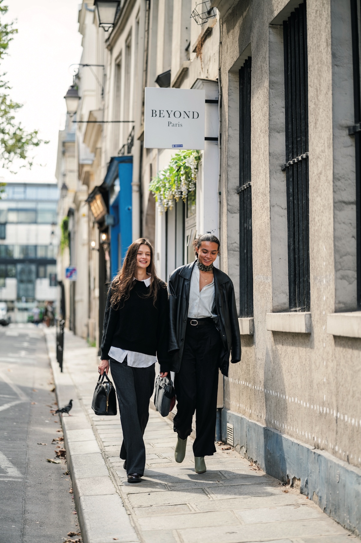マレ地区のとあるカフェで出会ったふたりは生粋のパリジェンヌで、年齢も同じ。エージェンシーは違えど10代の頃からモデル仲間だそう。揃って高身長なことと、装いを黒・白・グレーといった無彩色でまとめていることの相乗効果で遠目から見てもかなりクールでお洒落。彼女たちは終始、和やかなムードで、「仕事の話からプライベートの相談まで、なんでも話せる大切な友達なんだよねー」と笑顔で言い合える素敵な関係性も含めて魅力的だった。