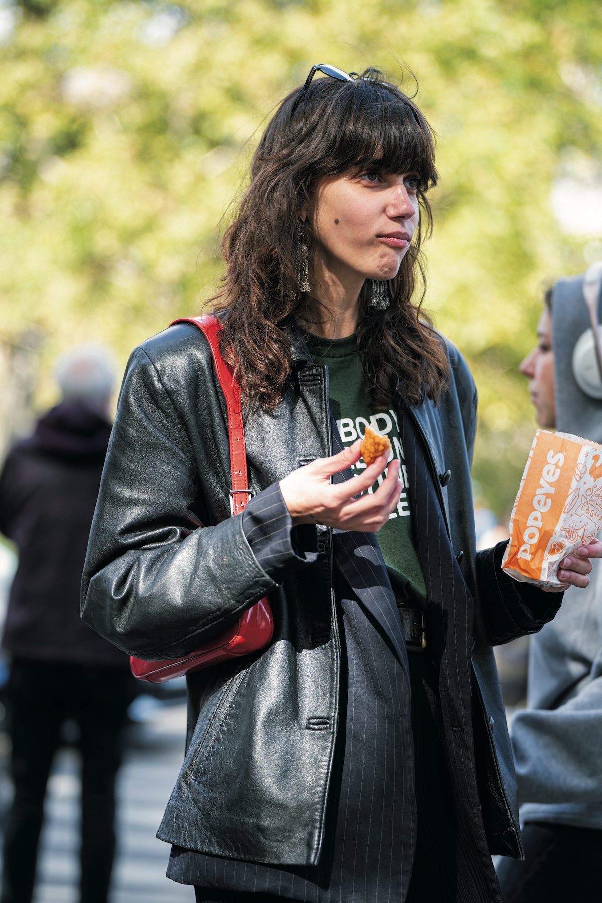 レピュブリック広場のすぐ近く、最近流行りの〈ポパイズ・ルイジアナ・キッチン〉のクリスピーチキンを友達と分け合う姿もサマになる。それは、ストライプ柄のジャケットとレザージャケットのレイヤード技のおかげ。