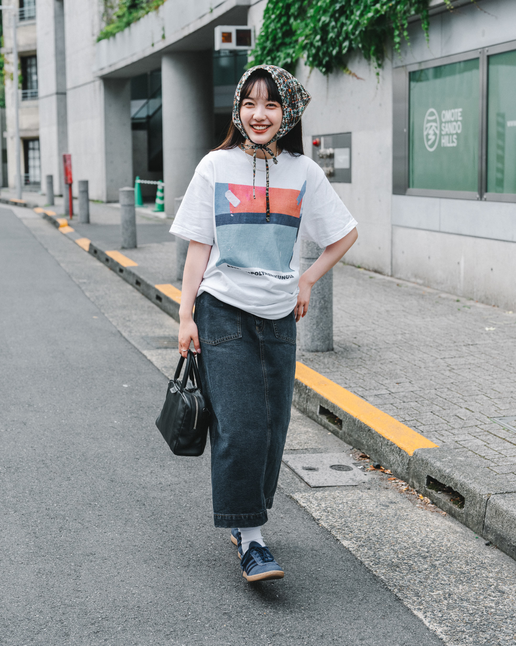 Tシャツ×デニムスカートの定番コーデは、カジュアルさを残しつつも大人っぽく格上げするのがおすすめ。例えばレザーバッグなどキレイめな小物、バブーシュカなど個性的な小物をプラスすれば、大人っぽい洗練された着こなしになります。スニーカーも少しキレイめなデザインを選ぶと◎。