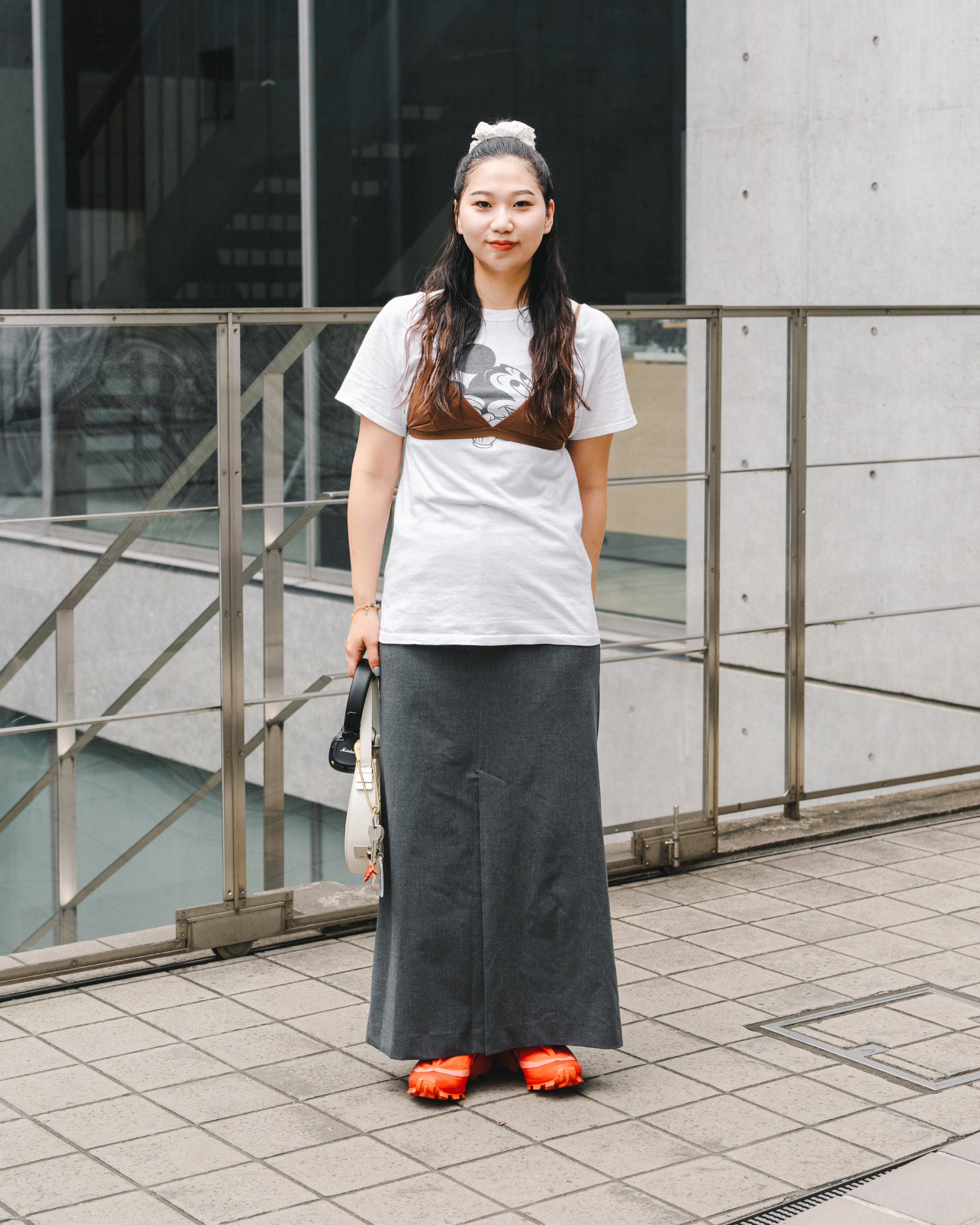 また、定番のコーディネートは小物で大人っぽさを演出したり、トップスの色あわせや素材感の違いで印象を刷新するのも着こなしのコツ。さらに、デニムスカートの丈によっては足元に視線が集まりやすいため、シューズでアクセントを加えたり、ワンポイント外したりするのもおすすめですよ。