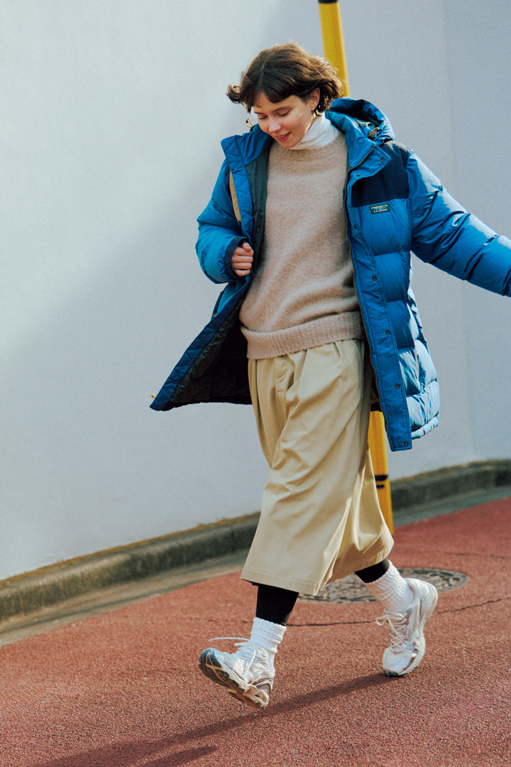 ジャケット¥41800/L.L.Bean(エル・エル・ビーン カスタマーサービスセンター)、セーター¥36300/Shetland Woollen Co.(グラストンベリーショールーム)、タートルネックカットソー¥6050/NARU Factory(南出メリヤス)、スカート¥25300/nanamica(ナナミカ D.W.S.)、バックパック¥25300/Root(島田商事)、ソックス¥1100/靴下屋(タビオ)、スニーカー¥16500/Mizuno(ミズノお客様相談センター)、タイツ/スタイリスト私物