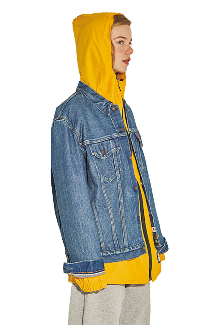 首元に色を差してみましょう!さてさて、生徒のみなさん! 早速、レッスンを始めていきましょう。1限目は、基本中の基本!「 ネックラインをどう見せる?」のテクニックです。お手持ちのGジャンのインナーはいつも同じTシャツ! なんてことないかしら?ほら、こちらを見て。Gジャンとトーンを合わせたシャツなら、品が良くて馴染みがいいわね。あえて、白シャツじゃないというところもポイントなのよ。そしてグリーンのタートルネックセーター。こちらは寒色系のお仲間ね。スポーティなトラックジャケットも新鮮でおすすめ。ジップが白なのも、いいコンビネーション。フーディはよく組みわせるでしょ。でもね、あえて意外性のあるナイロンのフーディをチョイスしたら、素材感にもメリハリが生まれてGOOD。都会的なストリートコーディネートの完成よ!