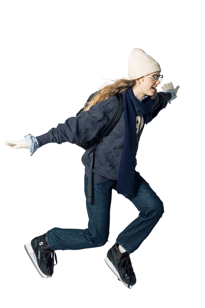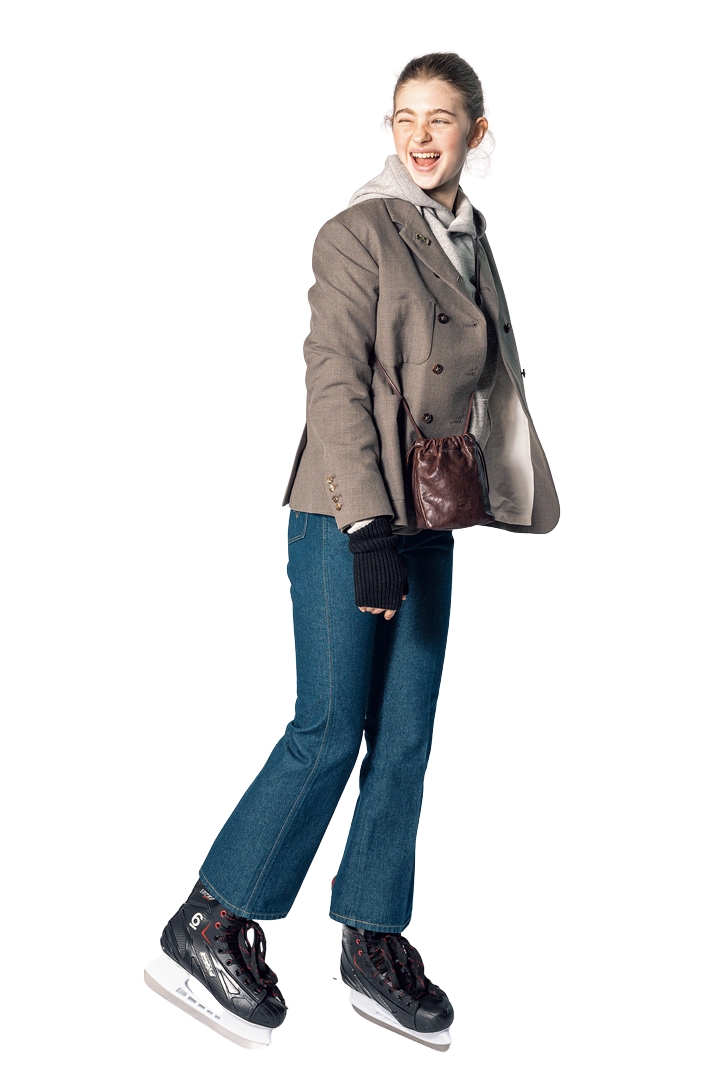 スウェットシャツ¥24200/HOLLYWOOD RANCH MARKET(ハリウッドランチ マーケット)、ブラウス¥36300/Nigel Cabourn WOMAN(アウターリミッツ)、デニムパンツ¥24200/Japan Blue Jeans(ジャパンブルー)、ニット帽¥10780、マフラー¥20900/ともにGREEN THOMAS(マッハ55リミテッド)、メガネ¥73700/EYEVAN 7285(アイヴァン 7285 トウキョウ)、バックパック¥5940/KiU(ワールドパーティー)、手袋¥14300/JoshuaEllis(真下商事)、ソックス¥990/靴下屋(タビオ)