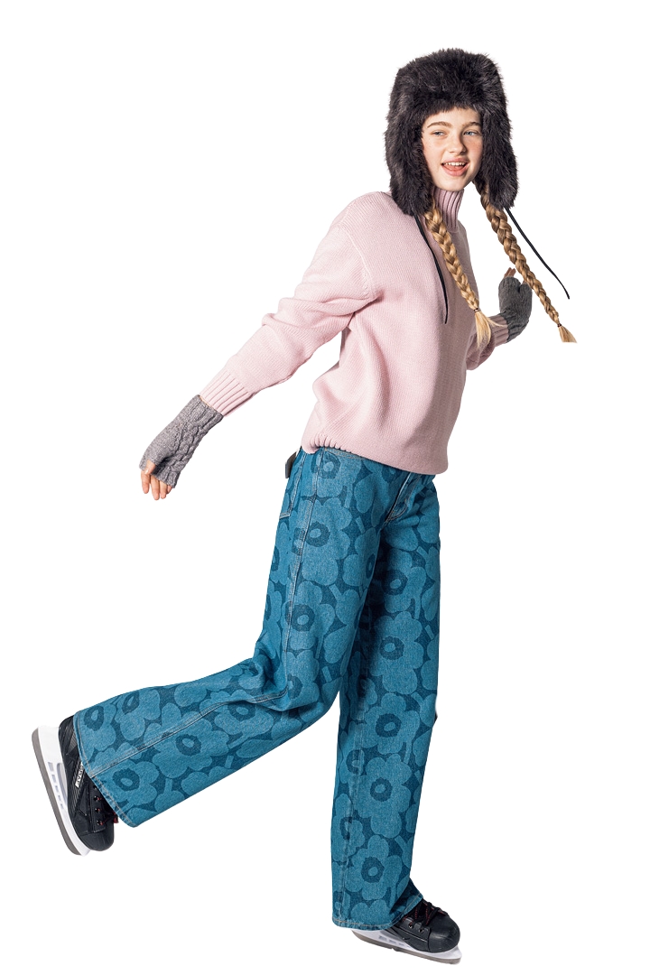セーター¥9990、ファーキャップ¥6990[ともに一部店舗限定]/Gap(ギャップ) 、デニムパンツ¥56100/Marimekko(ルック ブティック事業部)、手袋¥6050/BLACK SHEEP(アソシエイテッド・インターナショナル)