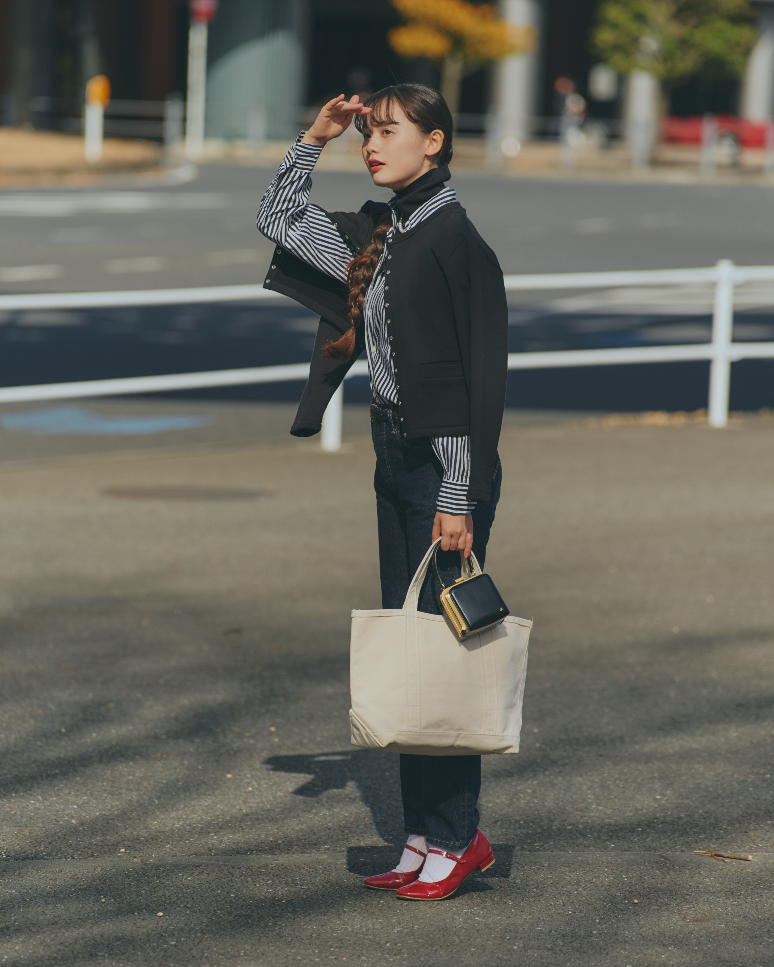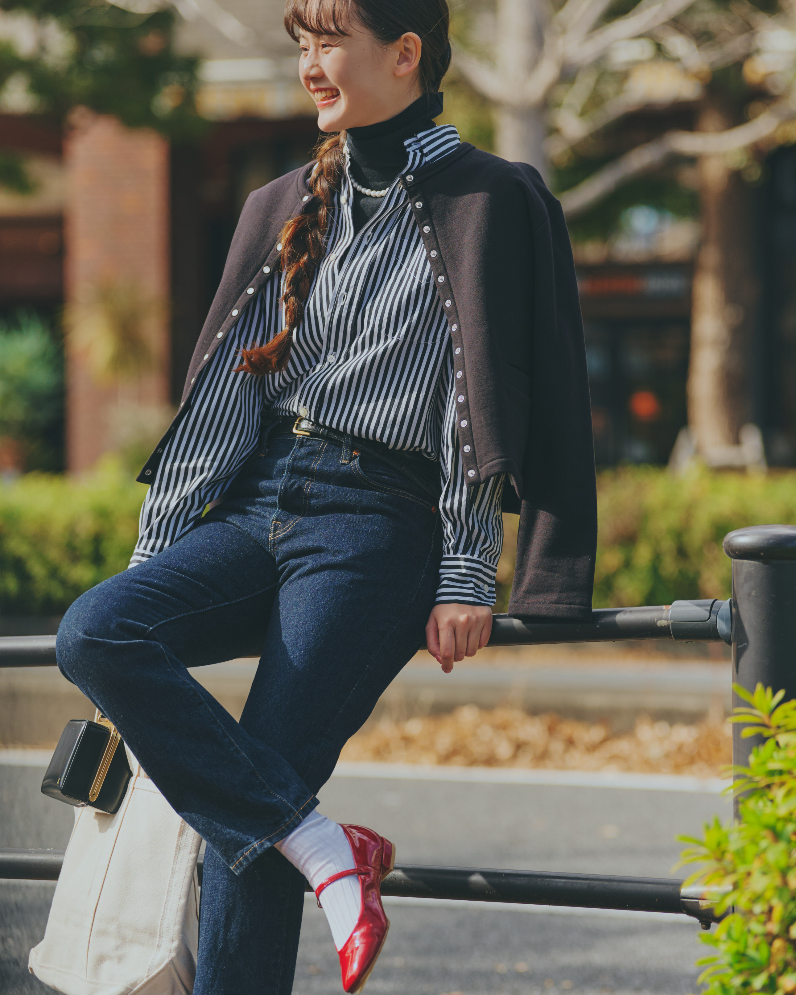 ストライプシャツに細身の濃紺ストレートデニムパンツで、クラシカルなパリジェンヌがお手本。肩がけした《アニエスベー》のカーディガンプレッション、真っ赤なメリージェーンがレディな雰囲気を高めてくれる。手元にはミニバッグとトートの二つもちでお洒落と利便性を兼ね備えて。