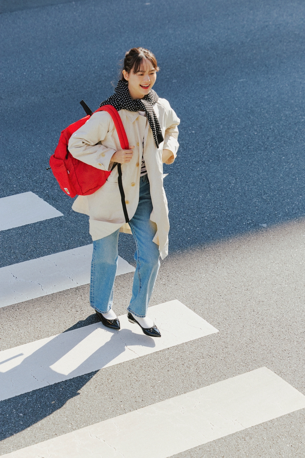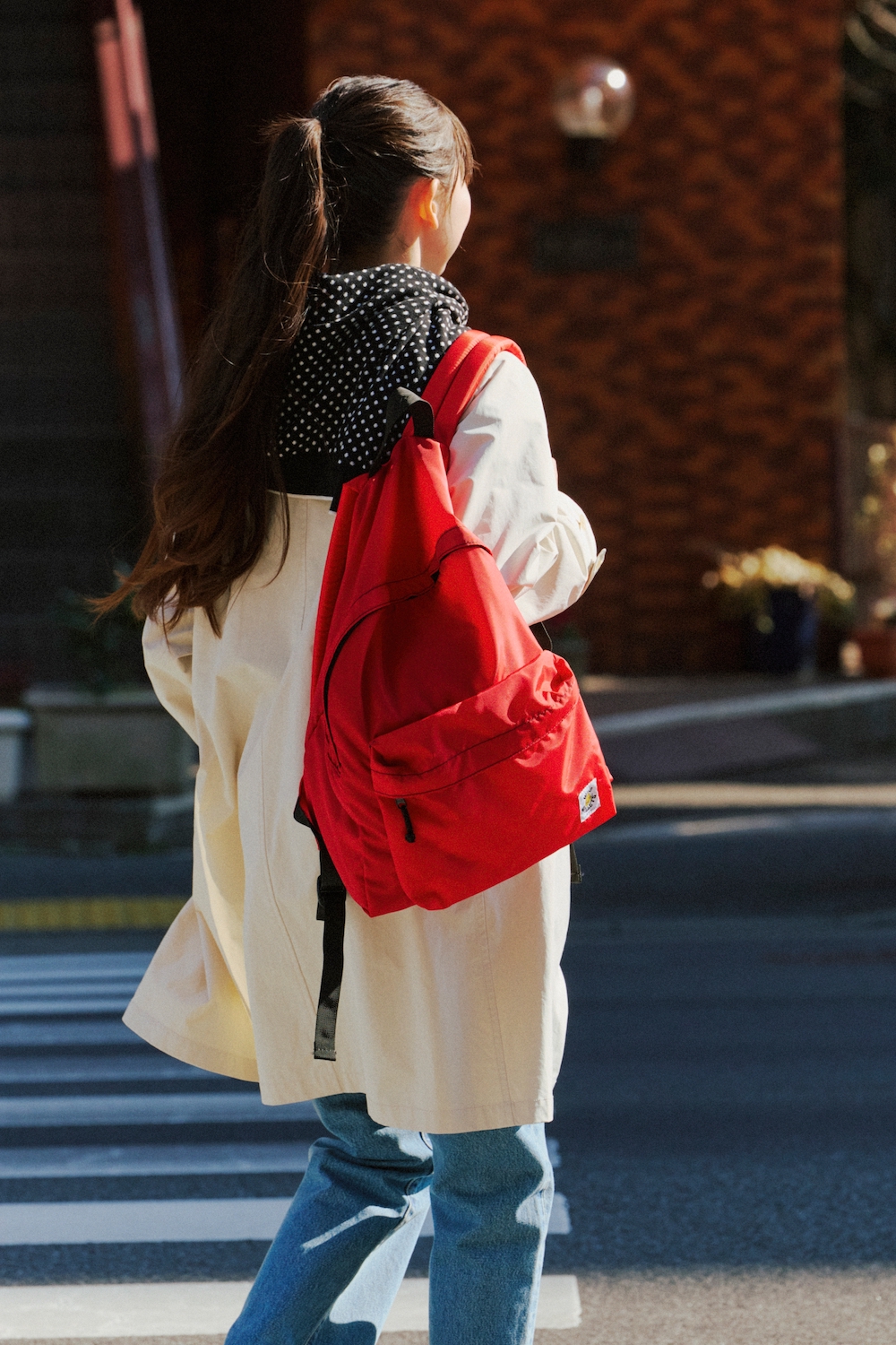 赤のバックパック¥12980/WILD WALLETS(城屋)、コート¥121000/SCYE BASICS(マスターピースショールーム)、カットソー¥20350/SAINT JAMES(セントジェームス代官山店)、デニムパンツ¥16500/Levi’s®︎(リーバイ・ストラウス ジャパン)、肩にかけたセーター¥39600/CABaN(キャバン 丸の内店)、シューズ¥18920/tsumori chisato WALK(モーダ・クレア)、ソックス/スタイリスト私物