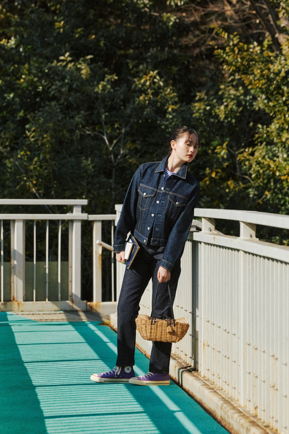 デニムジャケット¥41800、デニムパンツ¥28600/THE SHINZONE(シンゾーン ルミネ新宿店)、カットソー¥13970/MidiUmi(マザーズインダストリー)、バッグ¥74800/eb・a・gos(エバゴス)、シューズ¥9900/CONVERSE(コンバースインフォメーションセンター)