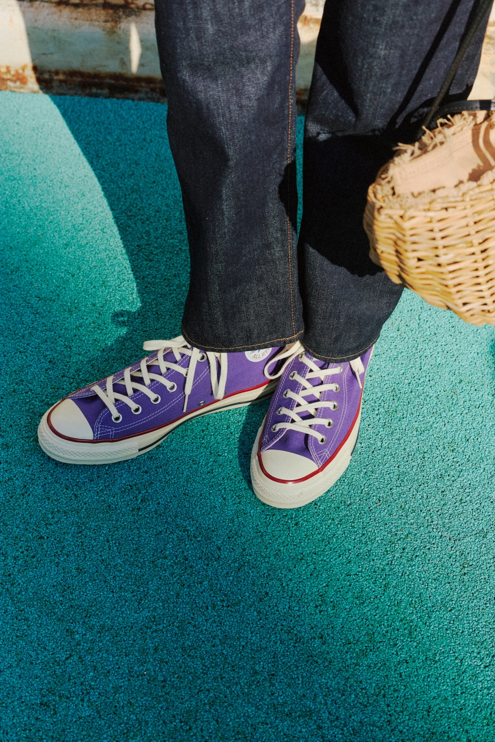 1917年に誕生し、マイナーチェンジを重ねながら長く愛され続けてきた名作「オールスター」。そのヴィンテージ感を彷彿とさせる「オールスター エイジド」は、濃い生成りのテープやシューレースが印象的で、まるでデッドストックのような風合いが魅力の一足。すらりと落ち感のきれいな濃紺デニムのセットアップから、パープルをちらりと覗かせてフレッシュなムードに。