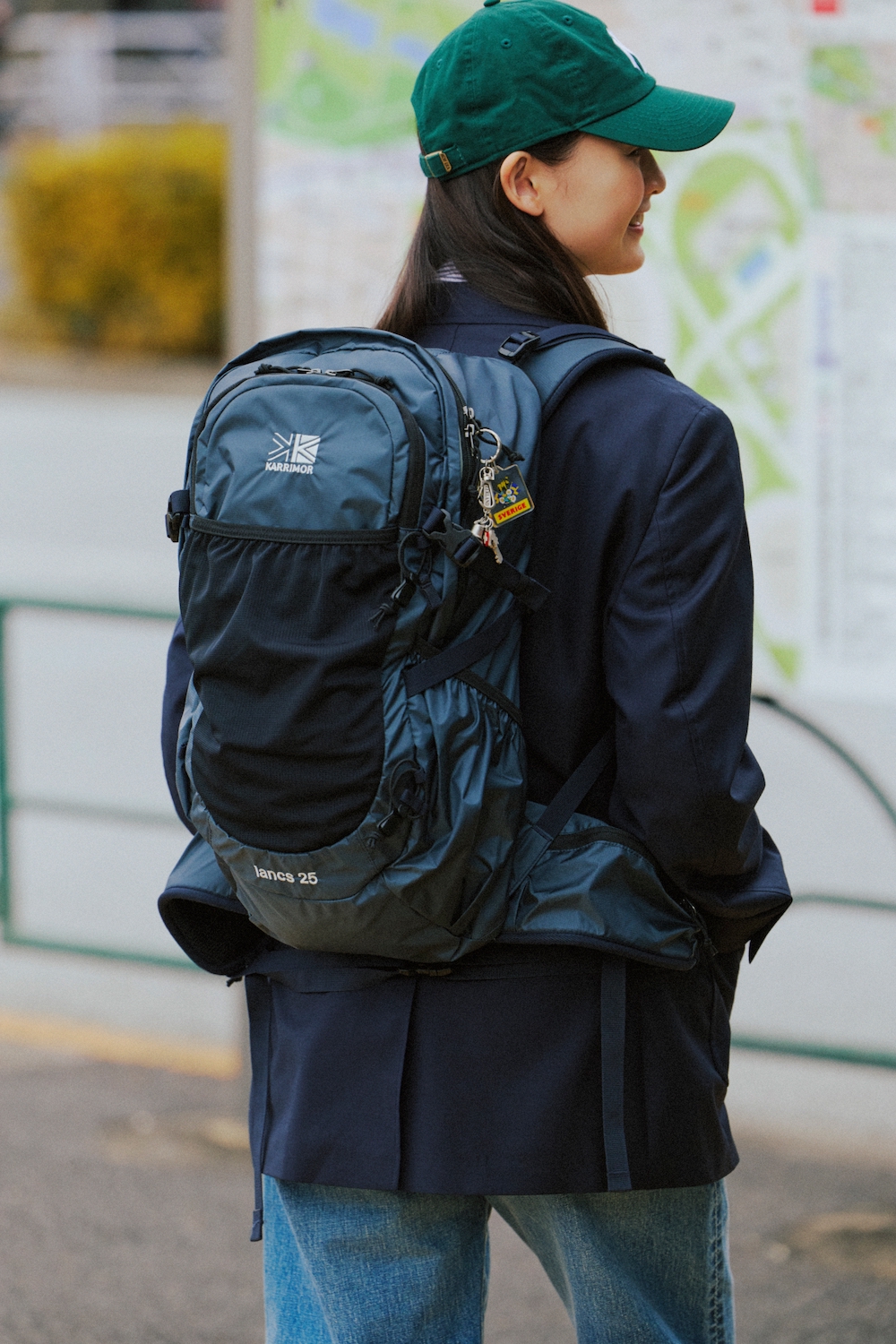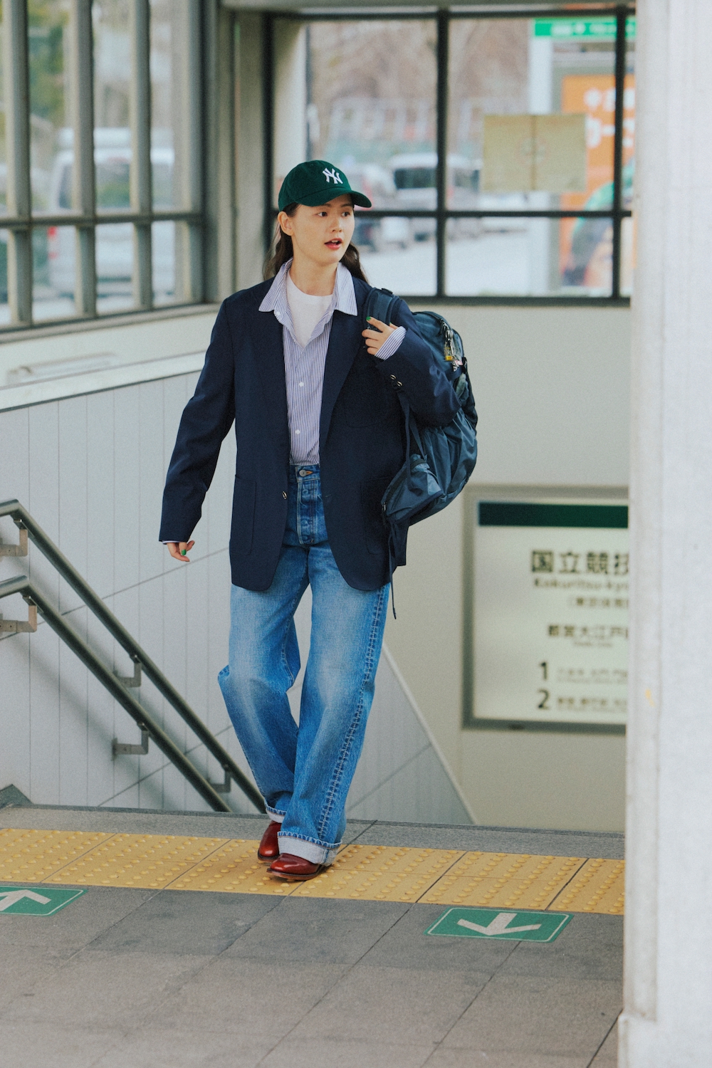 ジャケット¥203500/INDIVIDUALIZED CLOTHING(メイデン・カンパニー)、シャツ¥27500/YAECA(ヤエカ アパートメント ストア)、デニムパンツ¥30800/THE SHINZONE(シンゾーン ルミネ新宿店)、キャップ¥4620/New Era®︎(ニューエラ)、バックパック¥19000/KARRIMOR(カリマーインターナショナル)、シューズ¥42900/REGAL(リーガルコーポレーション)
