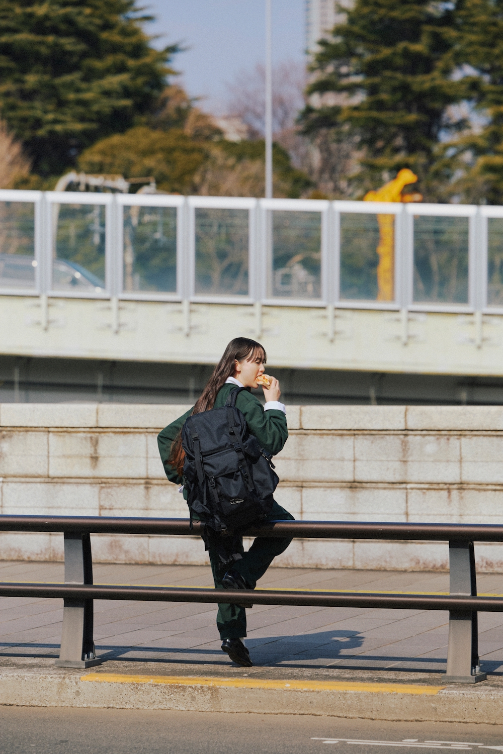スウェットシャツ¥25300、スウェットパンツ¥27500/ともにblurhmsROOTSTOCK(ワンダリズム)、シャツ¥27500/YAECA(ヤエカ アパートメント ストア)、バックパック¥¥27500/L.L. Bean(エル・エル・ビーン カスタマーサービスセンター)、シューズ¥19800/REGAL(リーガルコーポレーション)、ソックス/スタイリスト私物