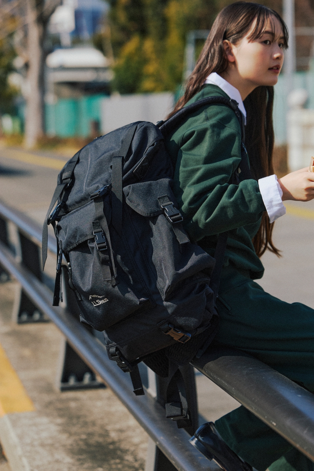 《エル・エル・ビーン》の「コンチネンタル・ウィークエンダー」は、多数のポケットにあれこれ詰め込めて、小旅行にも重宝。約37 Lの大きめサイズで、1日分のギアや着替えもしっかり収納可能。スウェットのセットアップに背負えば、コーデをキリッと引き締めてくれる。さらに、スウェットの光沢感やインしたシャツ、足元のレザーシューズで大人っぽく仕上げて。